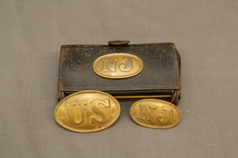 Believed to be Indian War McKeever cartridge pouch with brass plate on front marked "NJ", also incl two belt buckles "NJ" having four prongs on back, "US" with two loops on back.