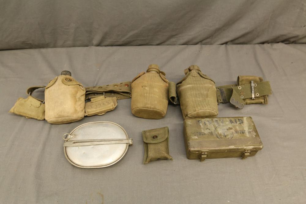 Military related field items incl canteens, first aid kit, first-aid pocket Carlisle model, belts with small pouches, mess kit, etc.