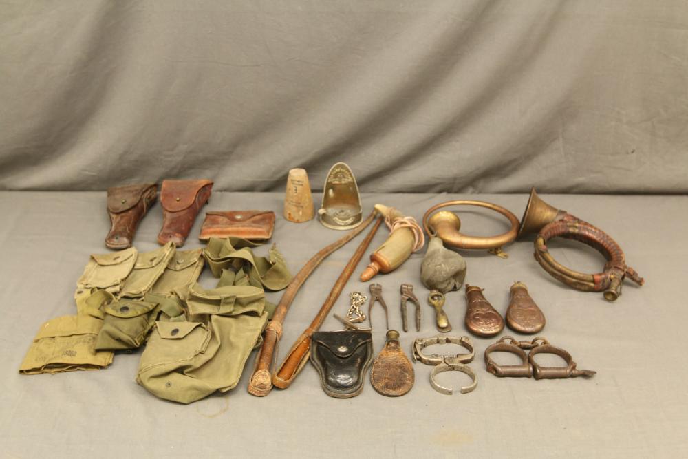 Military related items incl pouches, pistol holsters both marked "US", one leather and two metal powder flasks, musket ball tools, various styles of handcuffs, two horns one with leather wrapping marked "Furst Pless", other having no markings, believed to be British officers leather horse crop, and