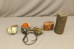 Wehrmacht model long case 1938-1945 maker code on pull strap "FRN44", eye piece marked "1940", also incl smaller gas mask believed to be child's gas mask having stamped Reichsadler on inside, headphones with canvas cover, Willson "sound barrier" ear muffs, binoculars marked on eye piece "Naval Officer 3X50".