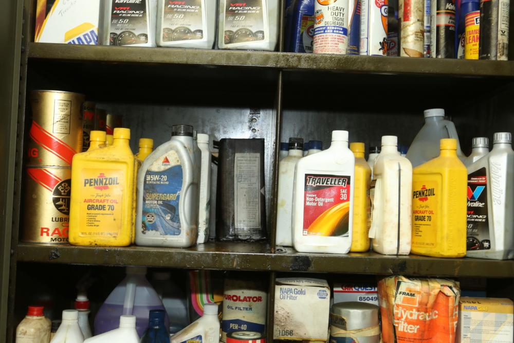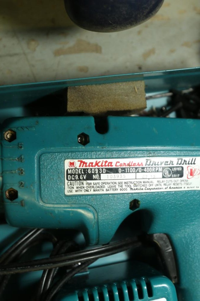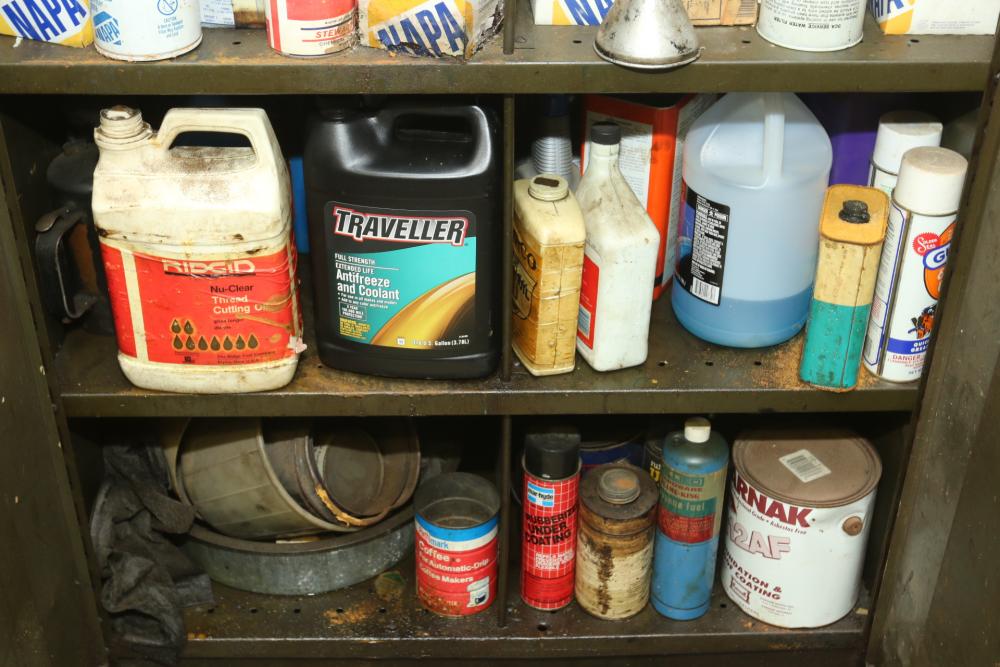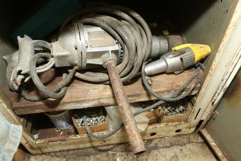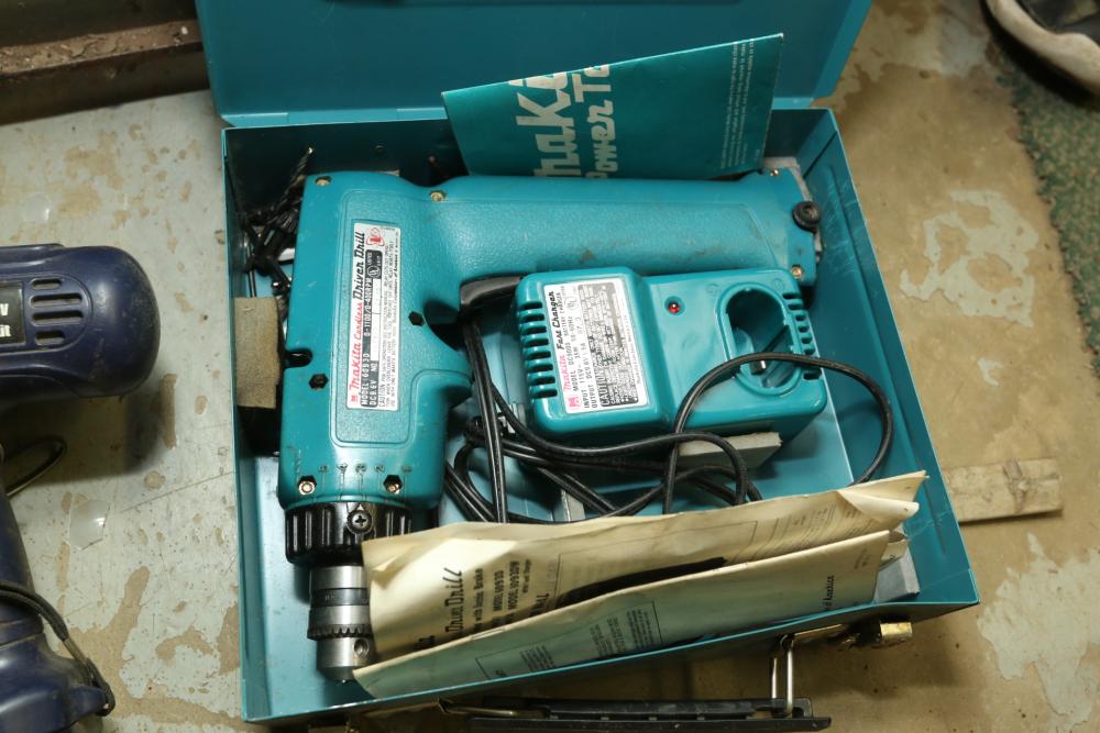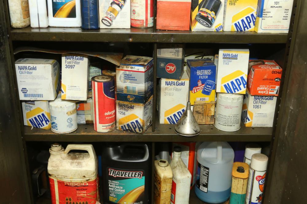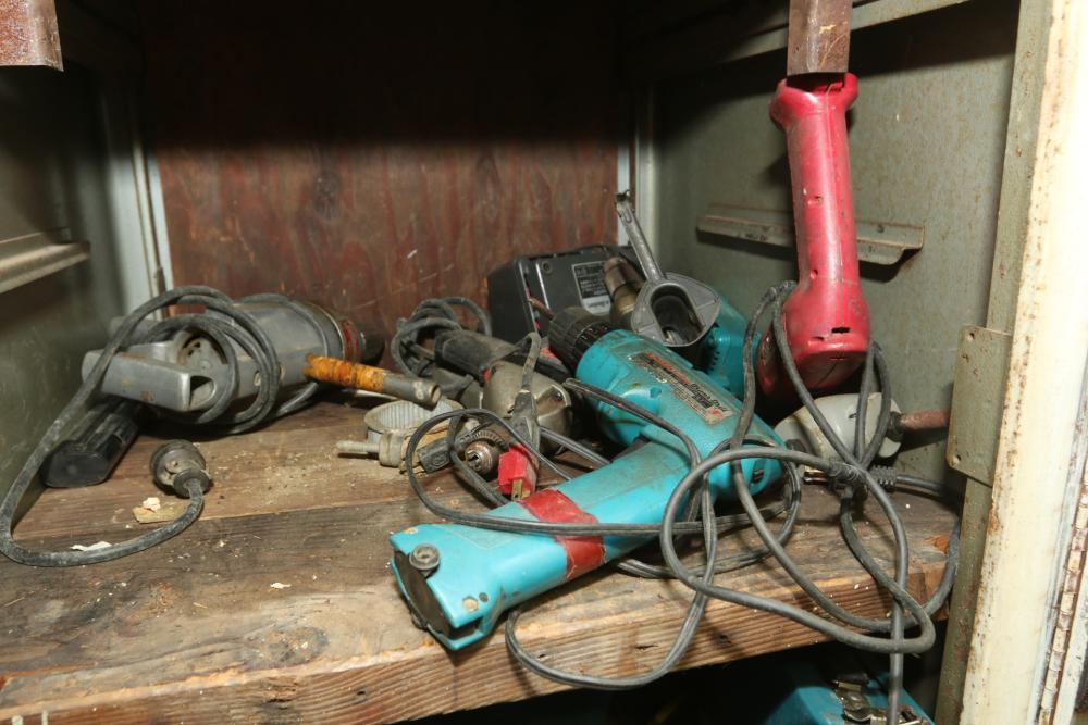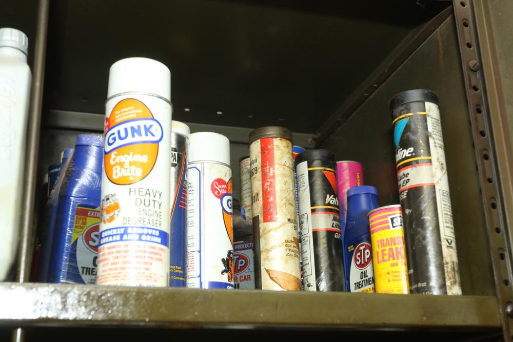 John Oster Cummins 1/2" heavy duty drill model 334, Craftsman 3/8" drill model 315.10510, Black & Decker cut-saw kit, Makita cordless driver drill model 60930, etc., also having assortment of engine oil, grease, additives, oil filters, automotive fluids, light bulbs, etc.