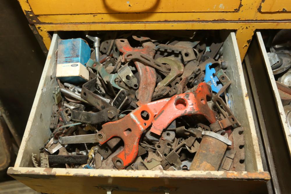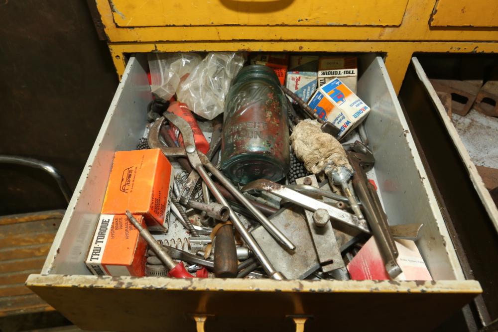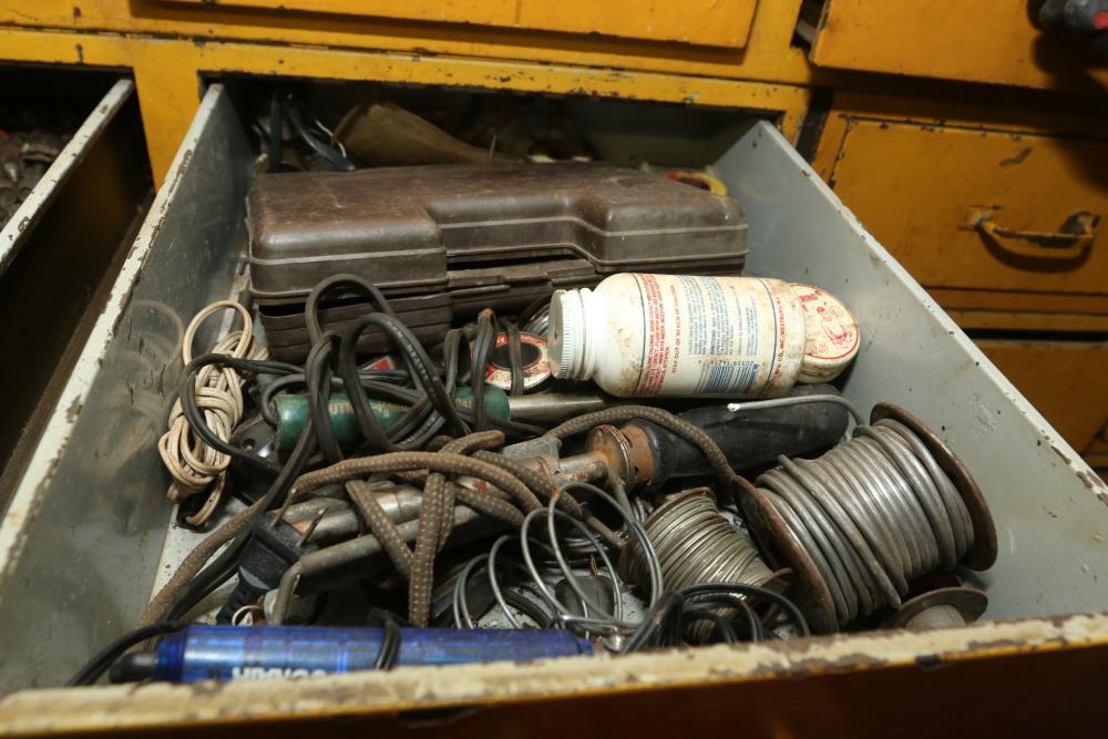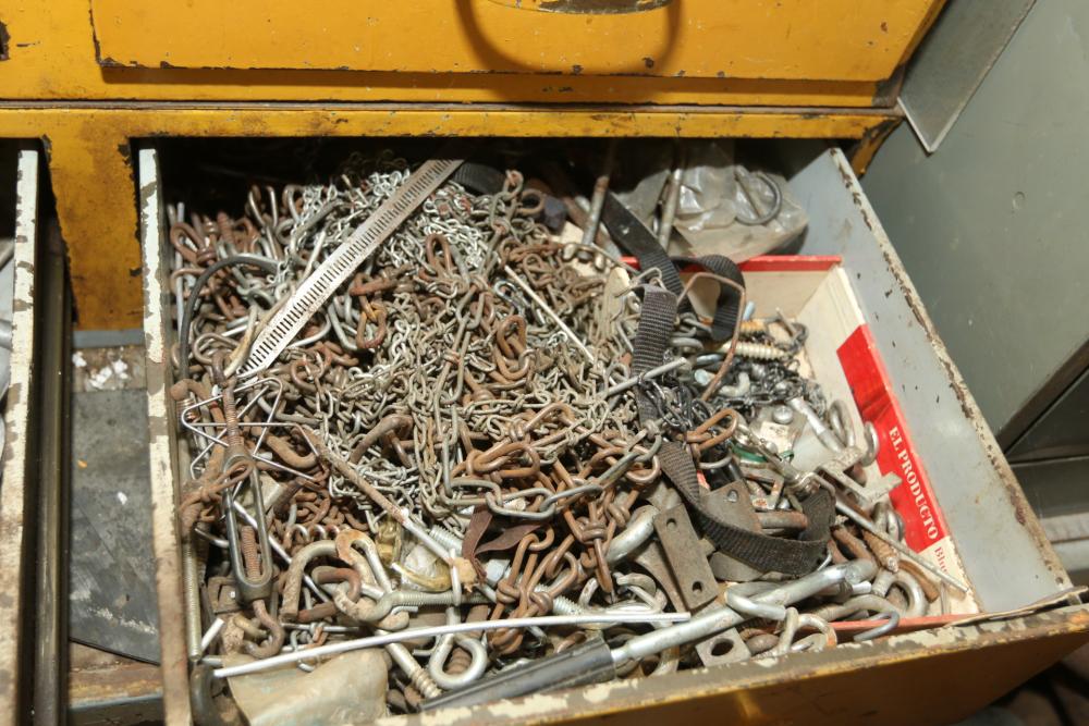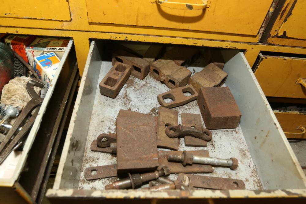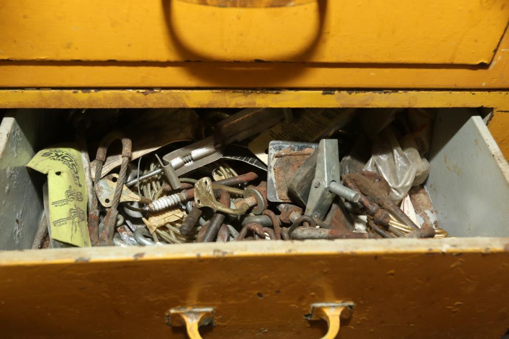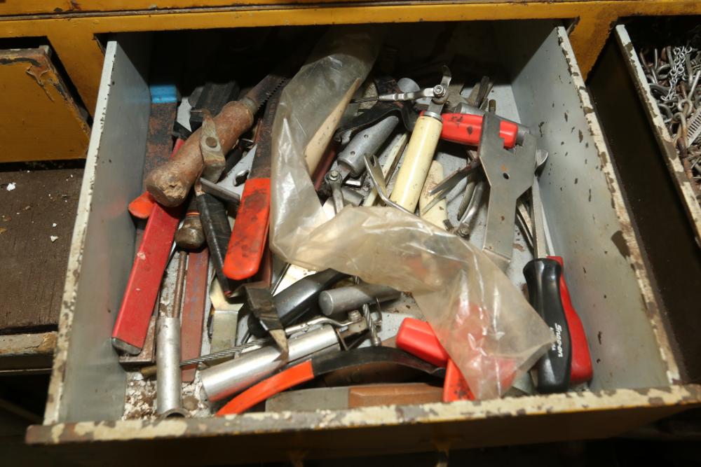 Hand tools, chains, hand saws, razor scrapers, bolts, washers, nuts, assortment of brackets, gas caps, wiring, hatchets, hammers, etc. Cabinet NOT included.