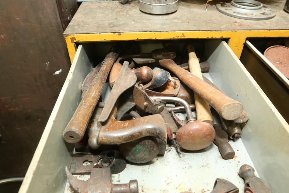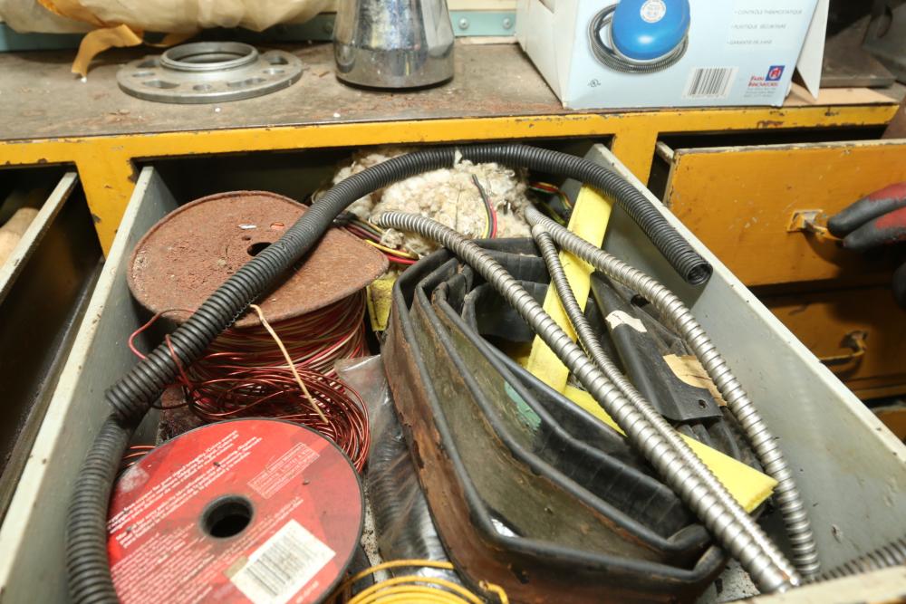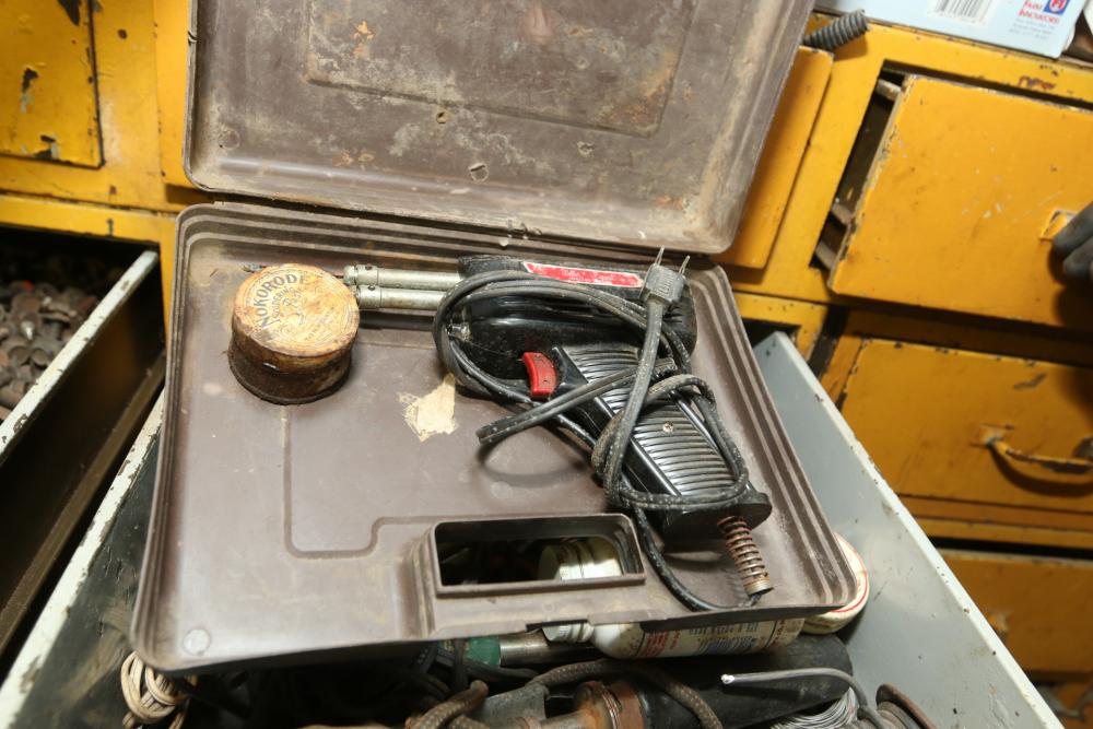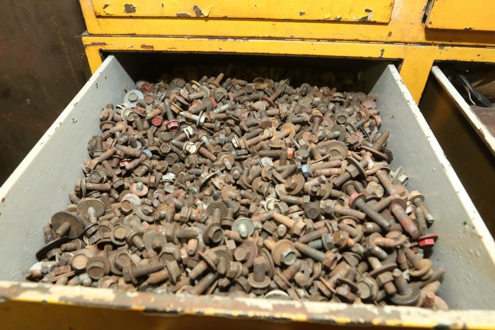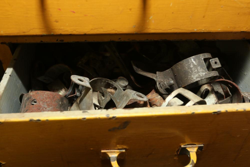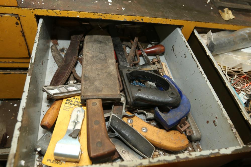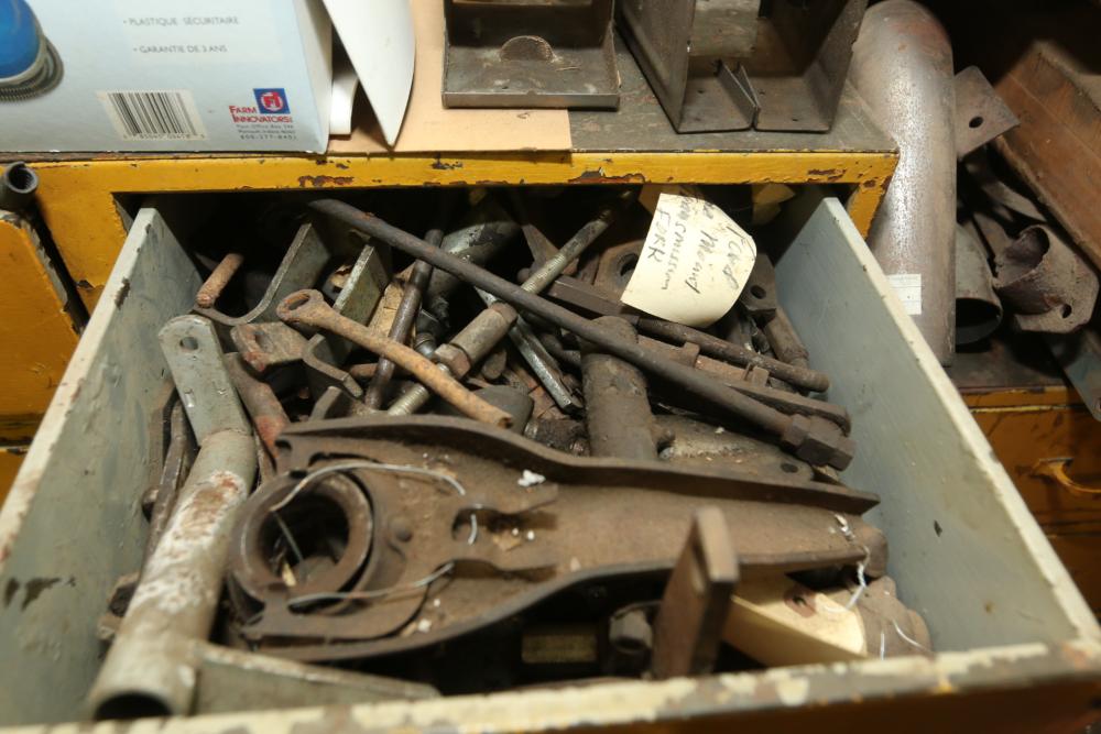 Hand tools, chains, hand saws, razor scrapers, bolts, washers, nuts, assortment of brackets, gas caps, wiring, hatchets, hammers, etc. Cabinet NOT included.
