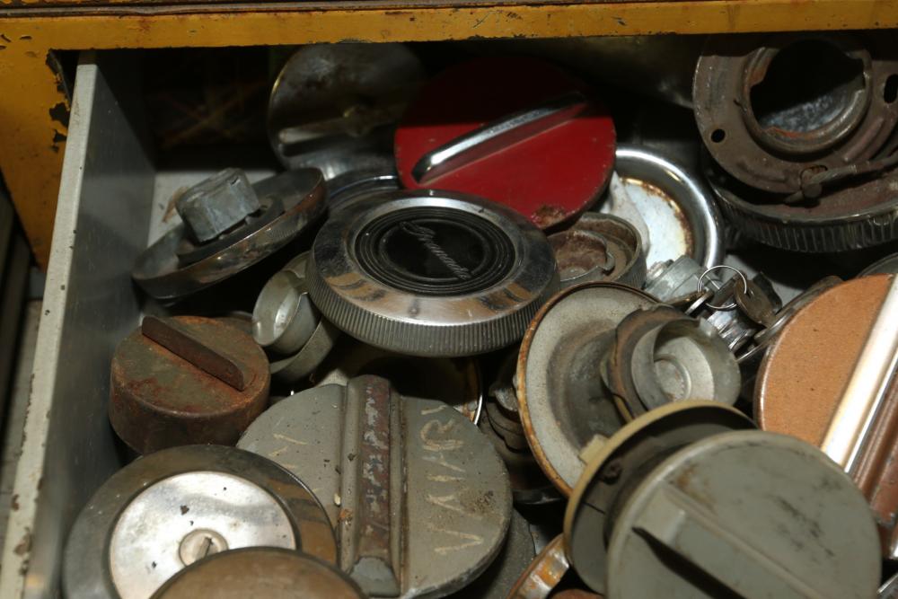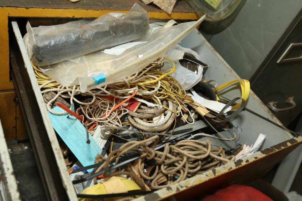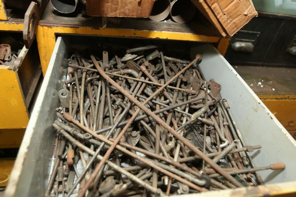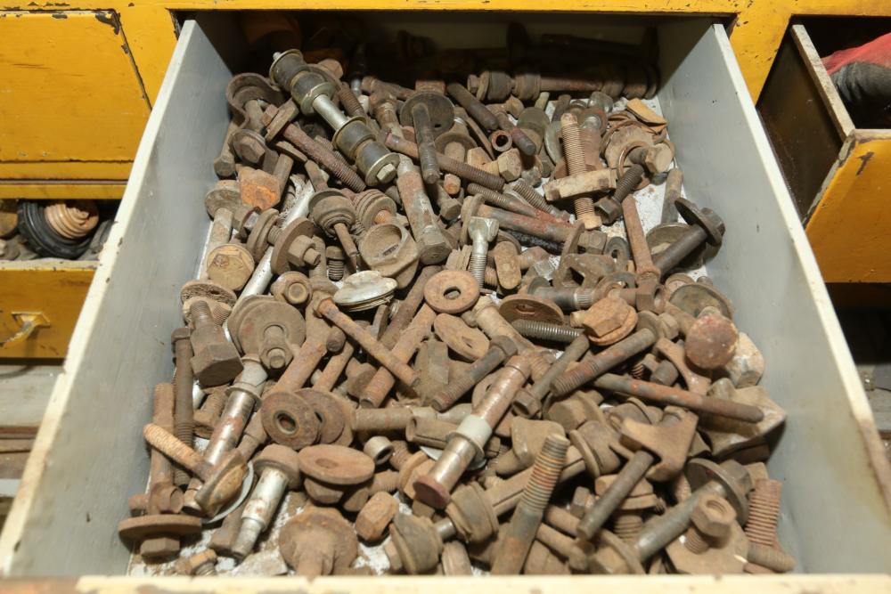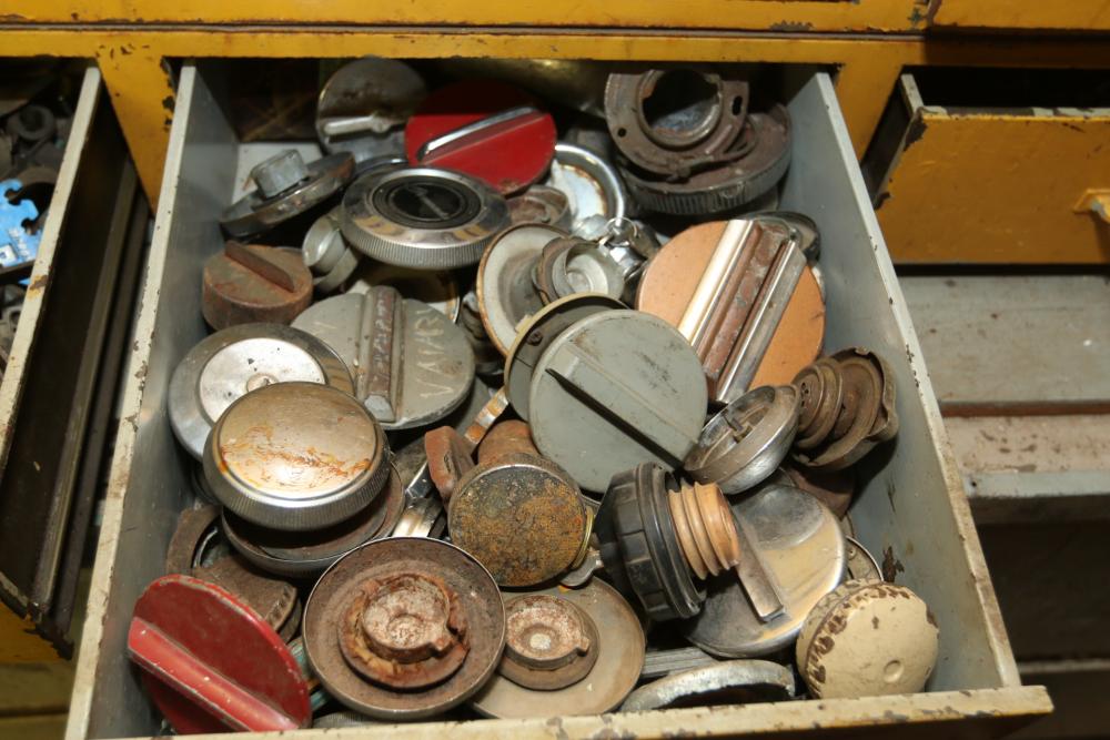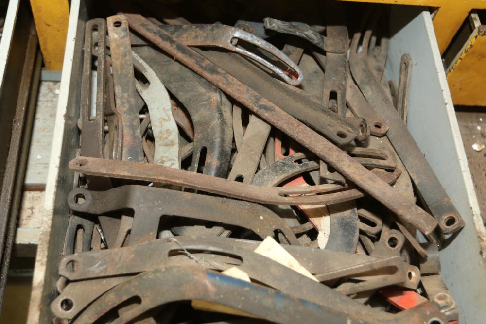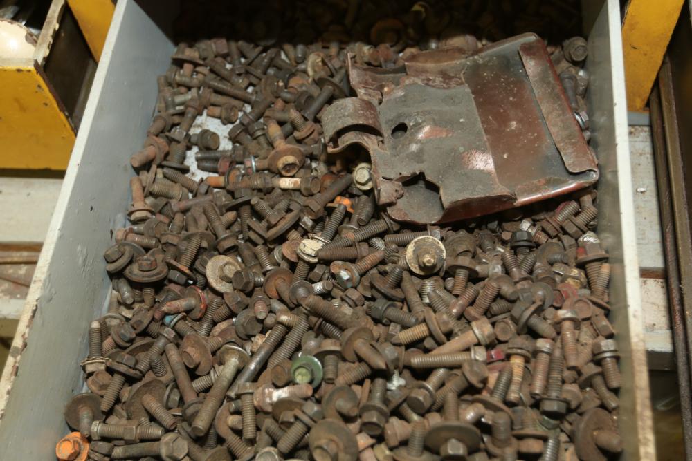 Hand tools, chains, hand saws, razor scrapers, bolts, washers, nuts, assortment of brackets, gas caps, wiring, hatchets, hammers, etc. Cabinet NOT included.
