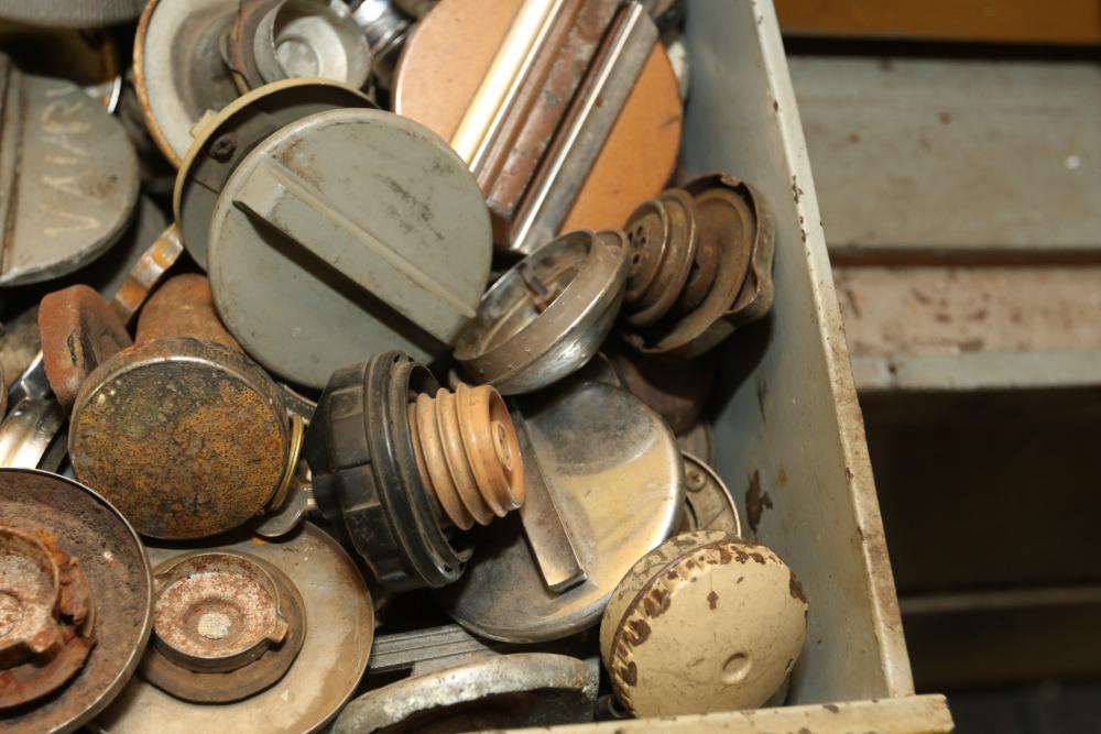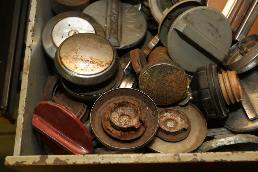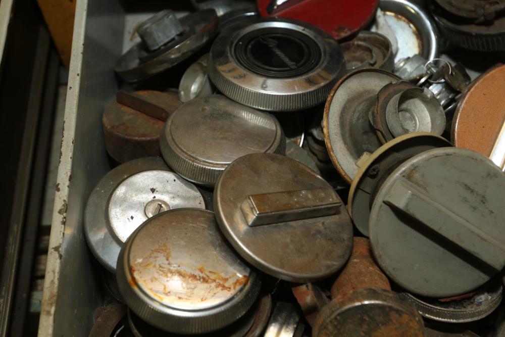 Items include automotive magazines & literature incl "Hot Rod" magazine, "Rod Action", "Truckin' ", etc.; Skat Blast sand blaster; license plates; exhaust piping/hoses/brackets, etc.; ball joint kits; camshafts/sockets/fittings; tap & dies; transmissions; manifolds; carburetors; headlights; fenders & doors; wheels; chrome bumpers; gas tanks; seats/seat frames; wheel covers; mufflers; brake drums; bolts of interior fabric; Kellogg-American air compressor; AC compressors; steering components; body panels; hoods; riding lawn mowers; axles; starters; walk behind push mowers and more. Items located in Ringoes, NJ.