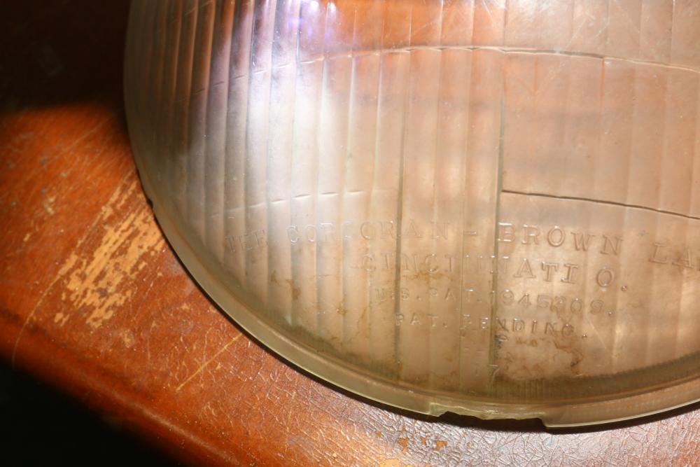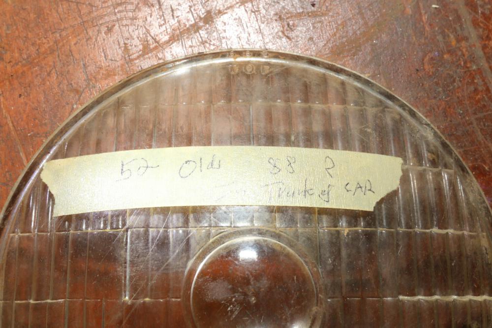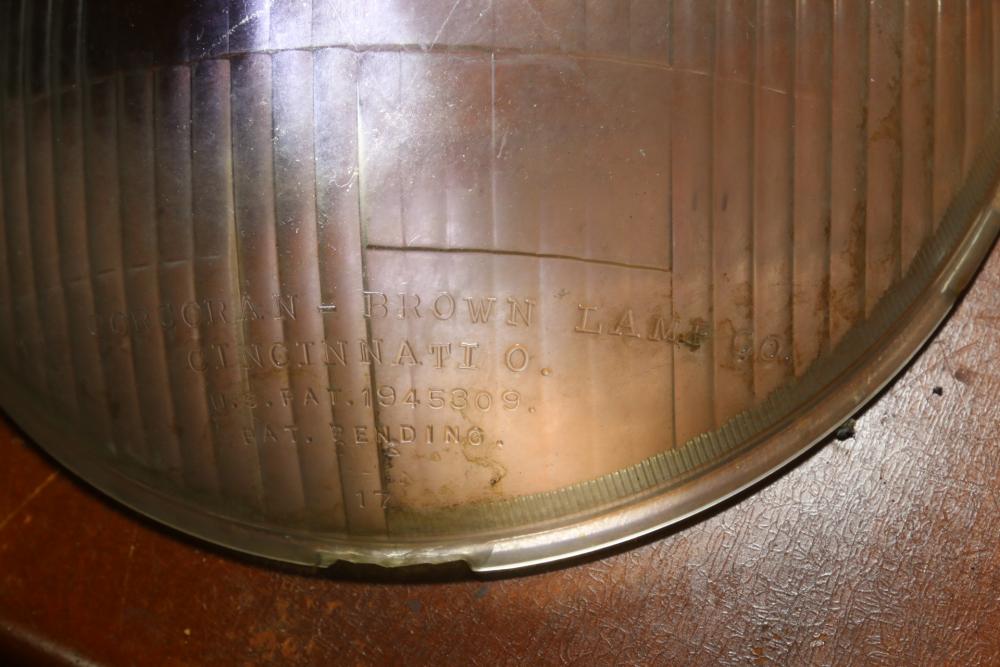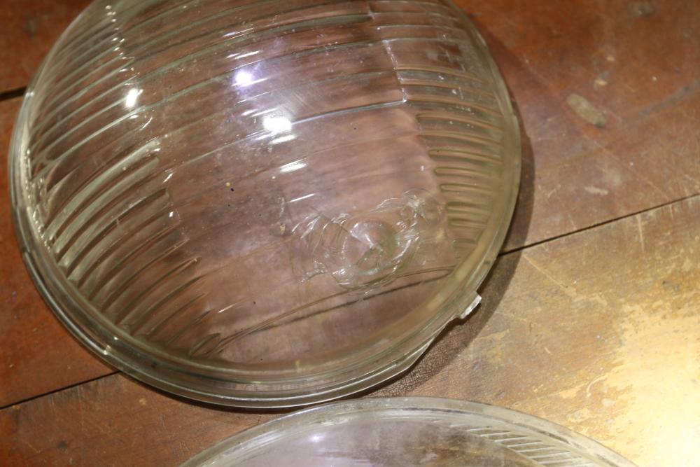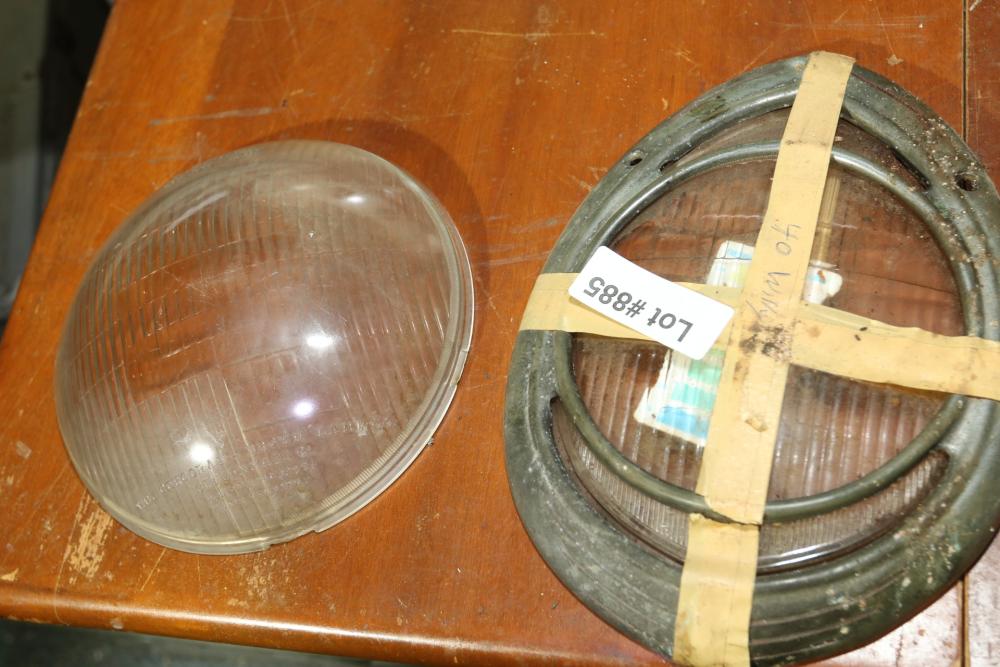Assortment of five headlight lenses incl one embossed "VW E1.0571.01", one with chrome trim, also having chrome trim and 1941 Ford taillight/rear marker light.