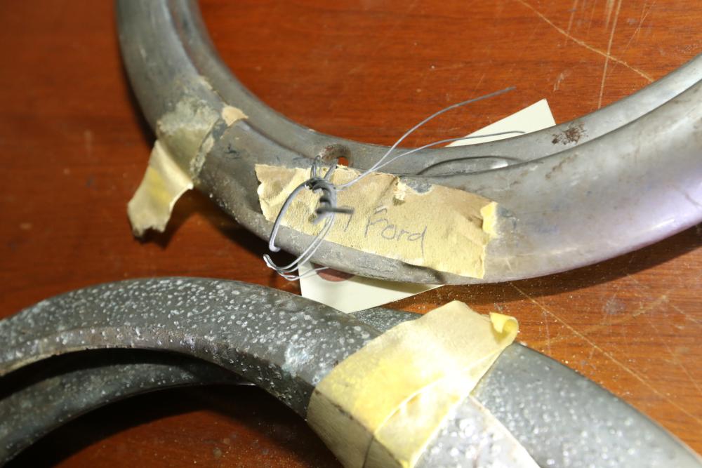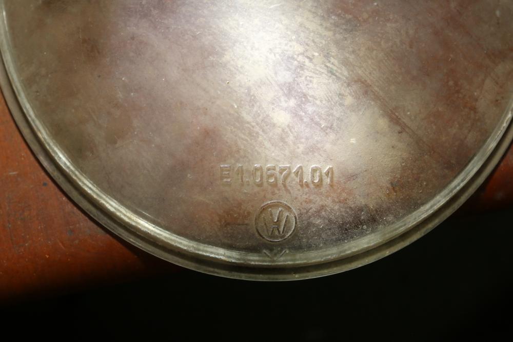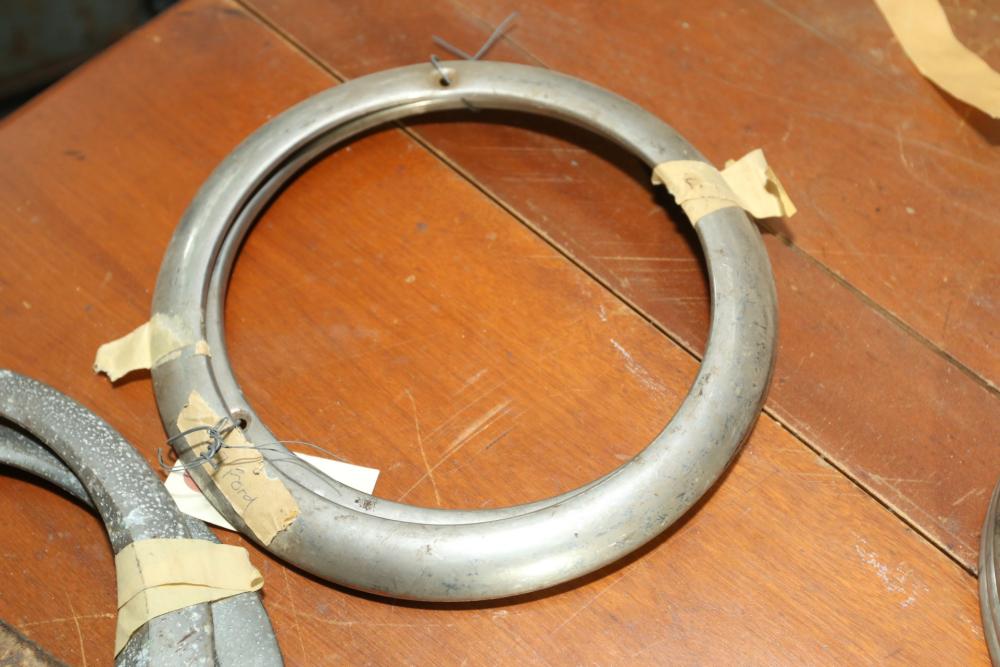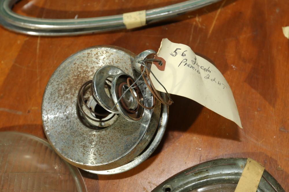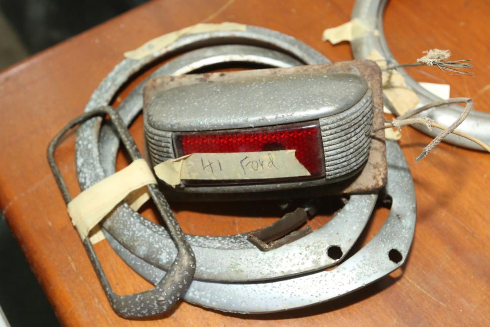 Assortment of five headlight lenses incl one embossed "VW E1.0571.01", one with chrome trim, also having chrome trim and 1941 Ford taillight/rear marker light.