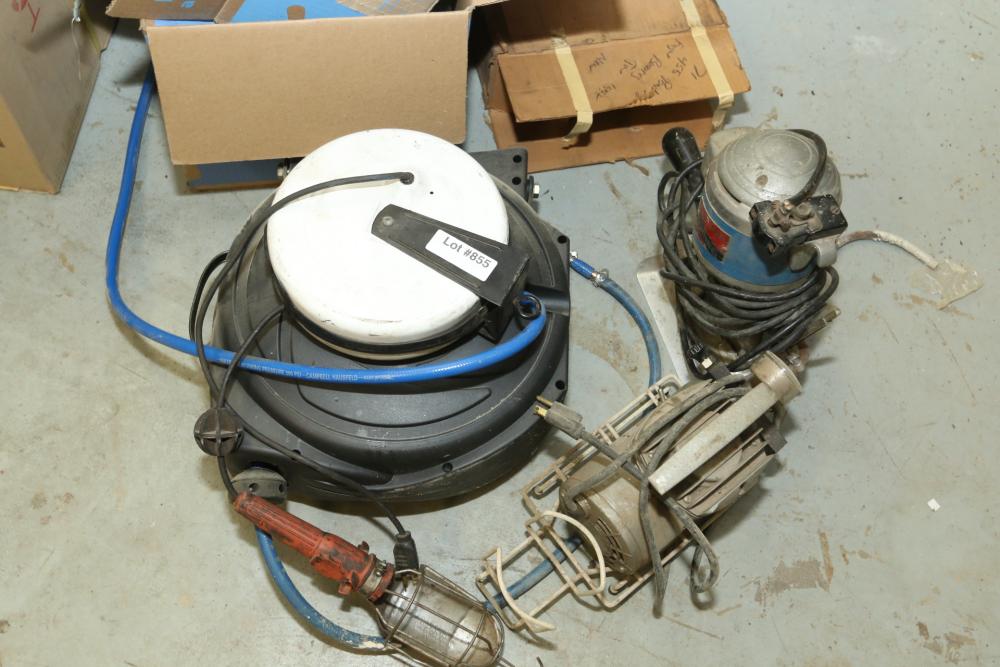 Legacy retractable air hose reel mounted to rafters, retractable work light reel, Eastman "Lightning" sander class 355, Thomas Industried Inc. "Medi-Pump" model 120-1, unmarked retractable air hose reel, etc. Bring proper tools and equipment for safe and proper removal.