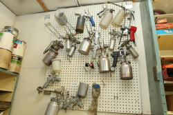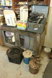 Sellco Corporation "The Payswell Sprayer" model J, Black & Decker "Heat 'N Strip" heat gun/paint remover, Central Pneumatic HVLP gravity feed spray gun item # 43430, General Purpose light-duty spray gun # 2Z363C, containers, etc.