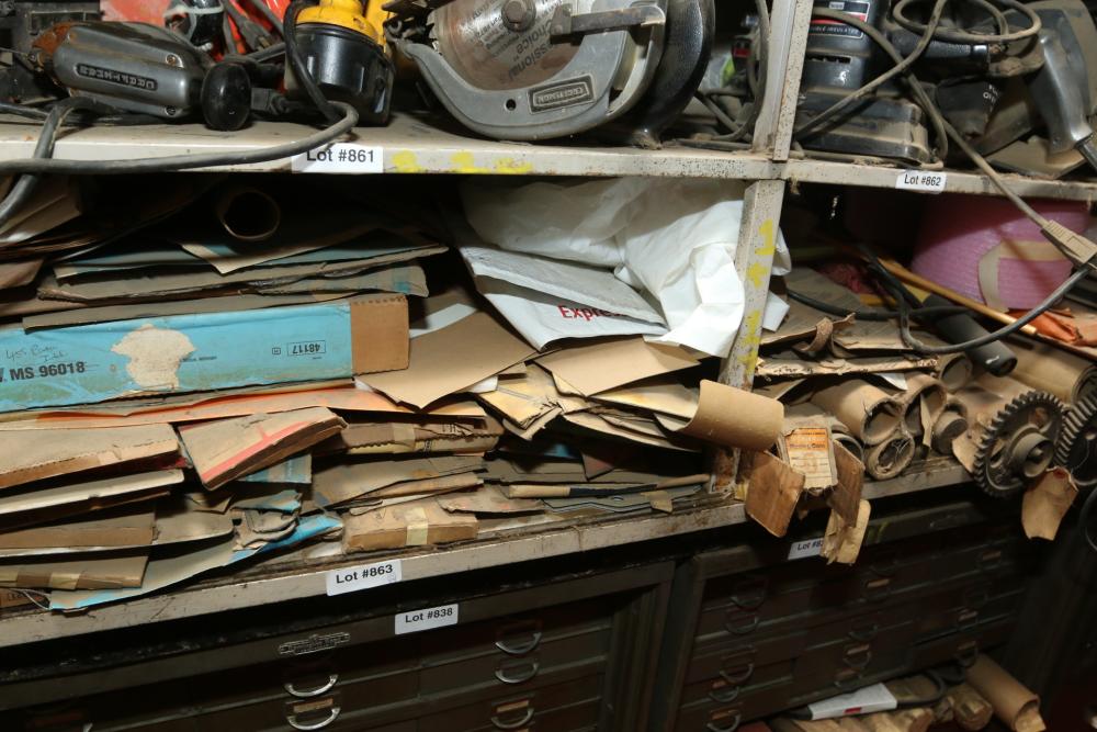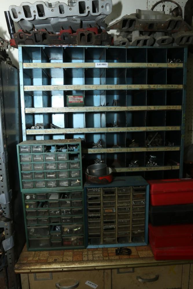 Organizer bins of hardware incl bolts, screws, grommets, rivets, spacers, nuts, etc.