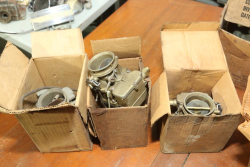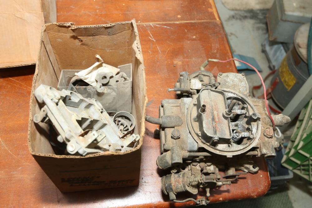 Carburetors and carburetor parts boxes marked incl Cherokee # 14-104, Bendix brake blocks 4515 ST 7", etc.