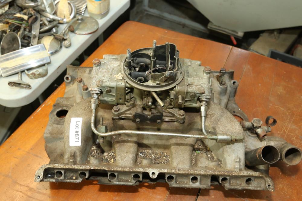 Items include automotive magazines & literature incl "Hot Rod" magazine, "Rod Action", "Truckin' ", etc.; Skat Blast sand blaster; license plates; exhaust piping/hoses/brackets, etc.; ball joint kits; camshafts/sockets/fittings; tap & dies; transmissions; manifolds; carburetors; headlights; fenders & doors; wheels; chrome bumpers; gas tanks; seats/seat frames; wheel covers; mufflers; brake drums; bolts of interior fabric; Kellogg-American air compressor; AC compressors; steering components; body panels; hoods; riding lawn mowers; axles; starters; walk behind push mowers and more. Items located in Ringoes, NJ.