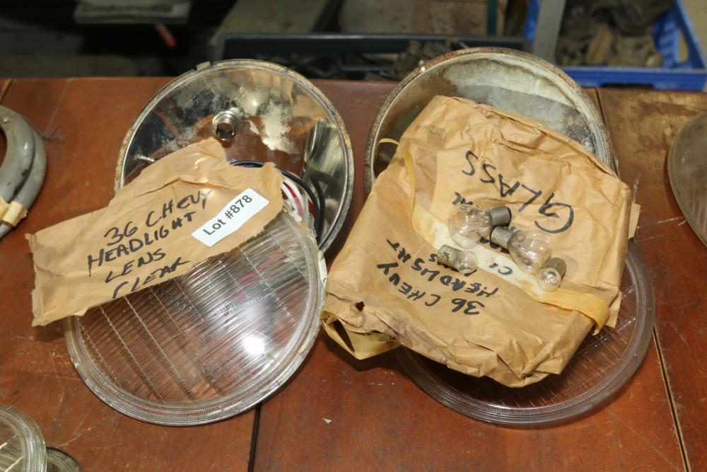 Pair of 1936 Chevrolet headlight lenses with deflectors, light bulbs, and wiring.