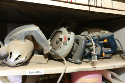 Power tools incl Skilsaw 6 1/2" circular saw, Ryobi circular saw, Skil drill # 599, Sears Craftsman 3" dustless belt sander model 315.11750, Sears Craftsman pad sander model 315.11650, etc.