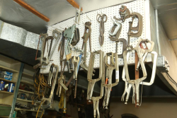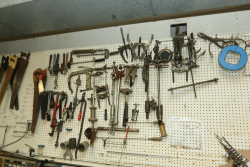 Tools incl Ridgid tube cutter, C-clamps, vise clamps, hand saws, extension cords, work light, jumper cables, etc.
