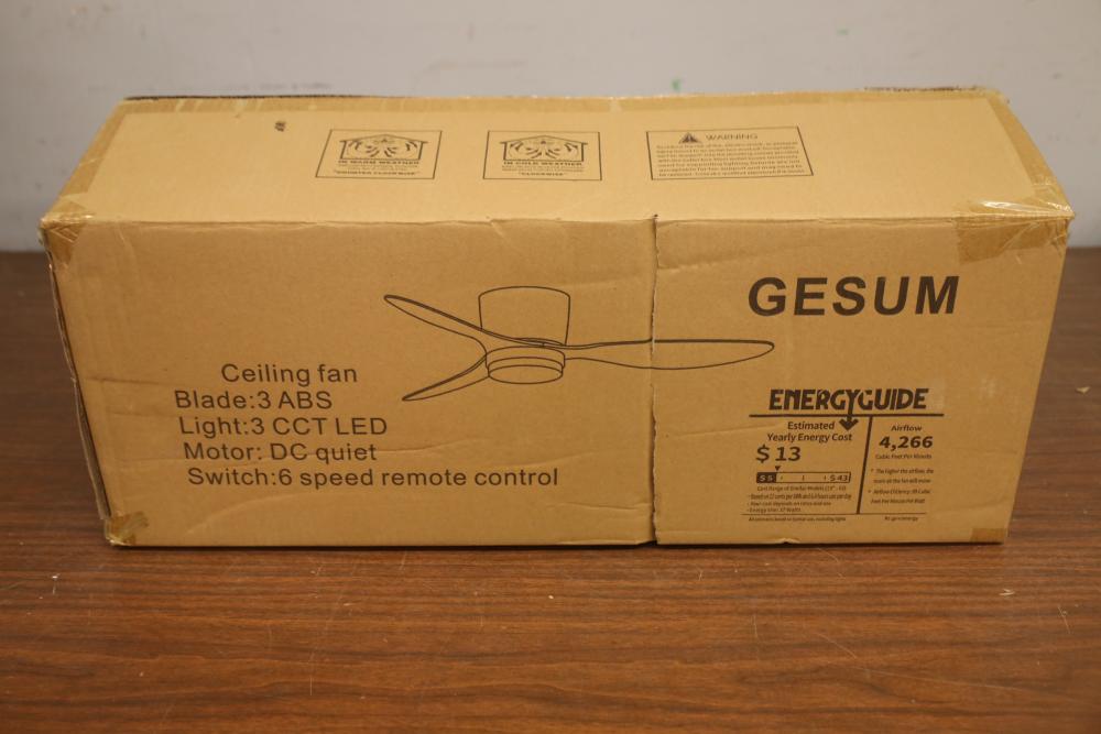 Gesum three blade ceiling fan with six speed remote control. Appearing to be new in box.