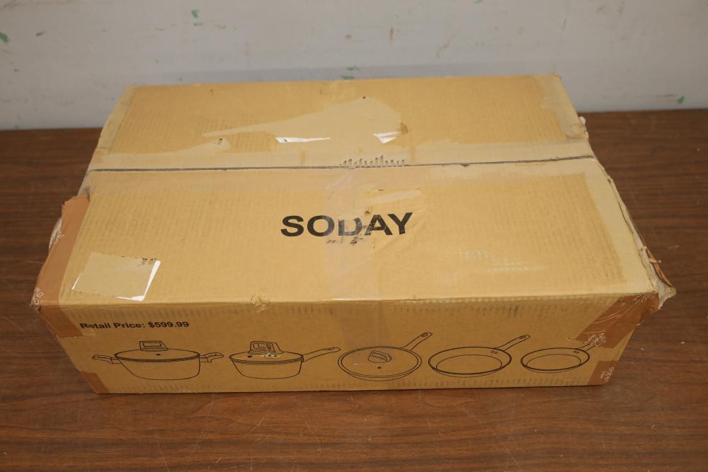 Soday cookware set incl steamer pan, sauce pans, silicone clamp/shovel/spoon, etc. New in original box.