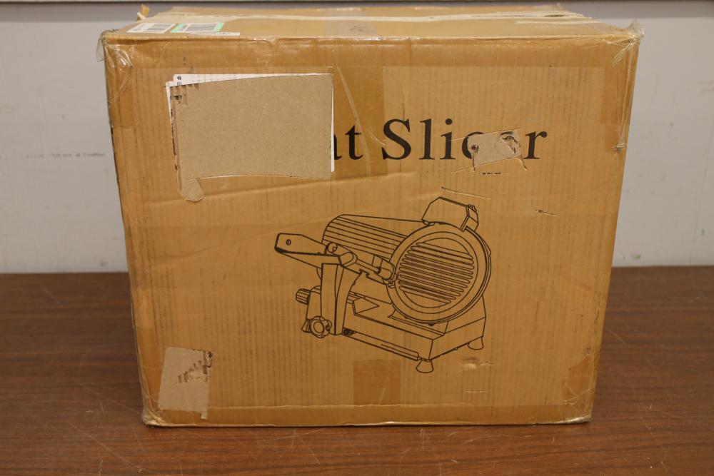 Meat slicer with 10" premium steel blade home and commercial use. Appearing to be new in original box.
