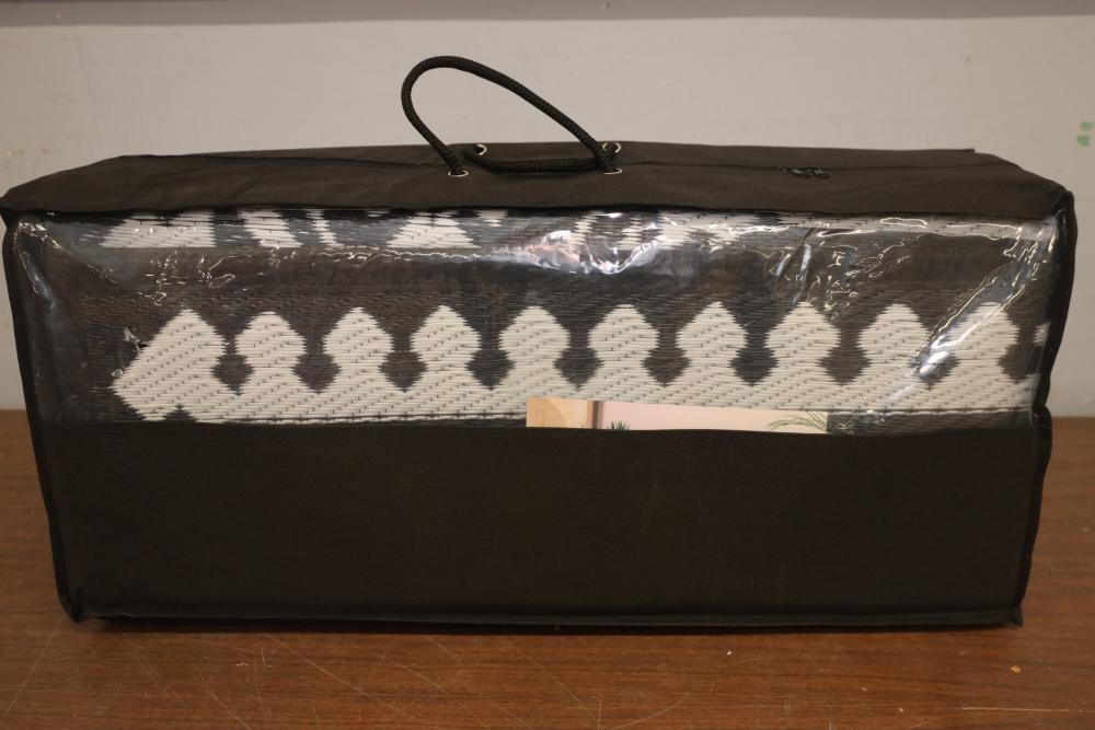 Black and white outdoor rug. Appearing to be new in original packaging.