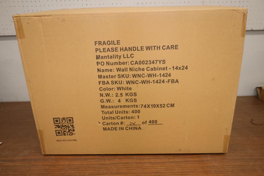 Wall Niche cabinet white in color, master SKU: WNC-WH-1424. Appearing to be new in original box.