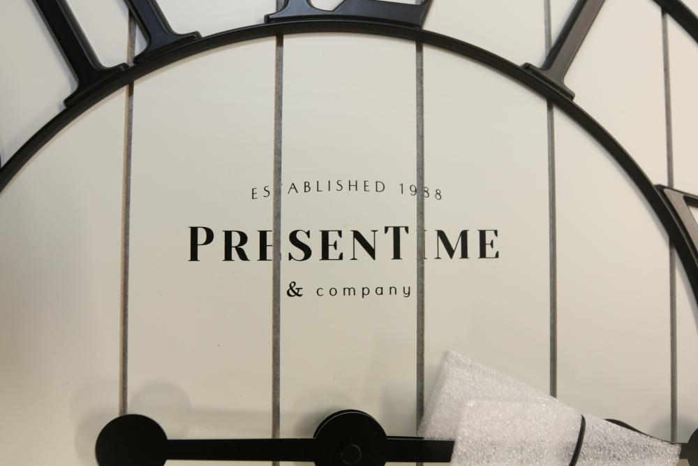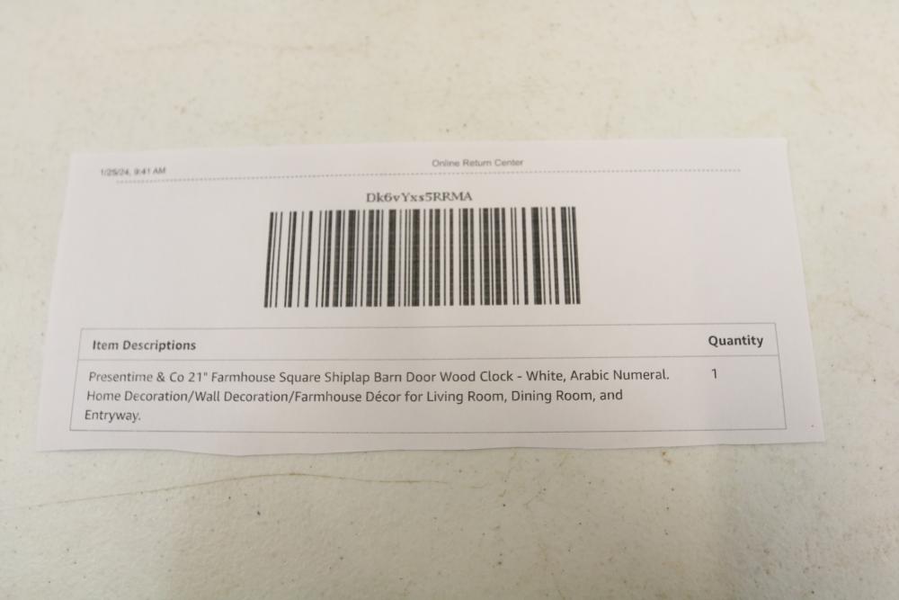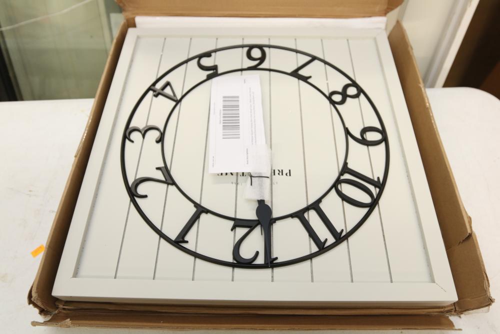 "Presentime & Co 21" farmhouse square shiplap barn door wood clock" painted white in color. Appearing to be new in original box.