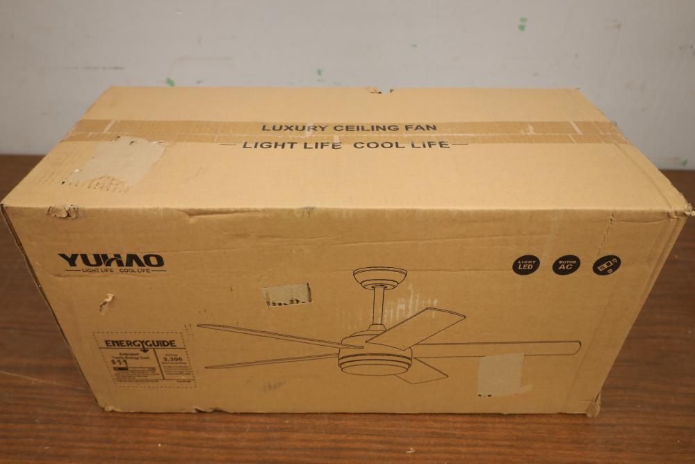 Yuhao five blade ceiling fan with light, white in color, model 1083. Appearing to be new in original box.