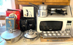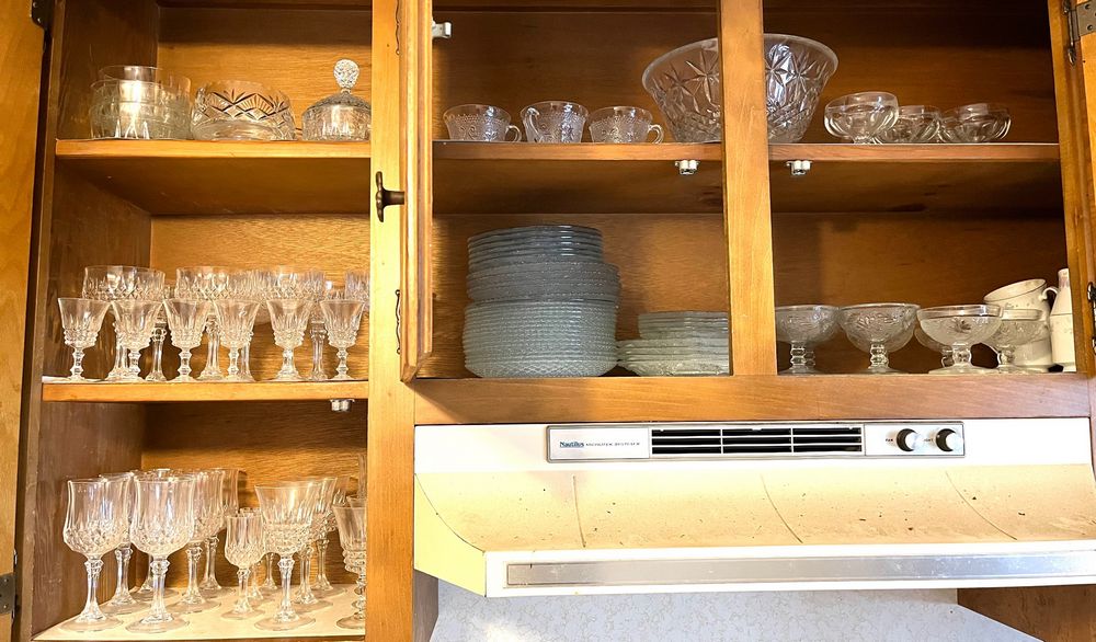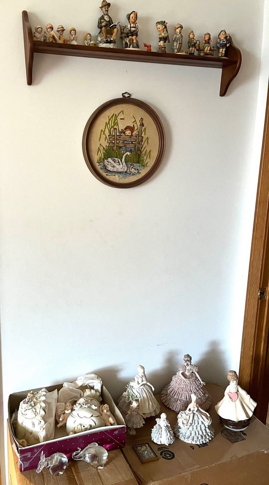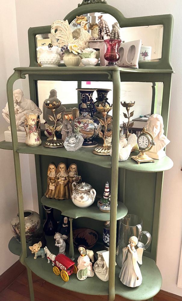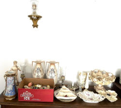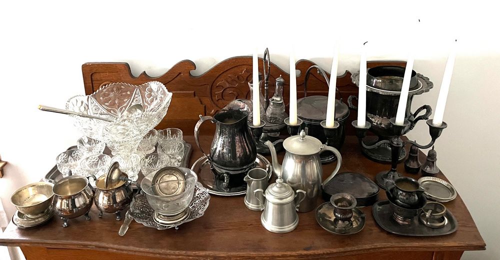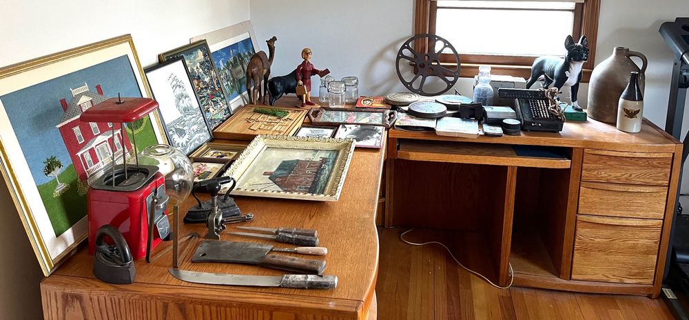 Items include Crystal d'arques glassware; Lenox bowl; Imperai pasta machine; N H Co. stainless steel flatware set; China: Mikasa/Edwin Knowles/China Garden; bench hall tree; antique baby carriage; prayer kneeler; small clocks; etagere & smoker's table; vintage/antique school chair/desk; 50" TV; Proform treadmill; Hitchcock loveseat; Edison home phonograph; Analee dolls; roll-top desk; Dept 56 Heritage Village characters; antique cabinet Victrola; decanters; Yard Man 550 push mower; electric edge trimmer; Weber gas grill; vintage tools; mirrors; lamps; wall art and more. Items are located in Wethersfield, CT.