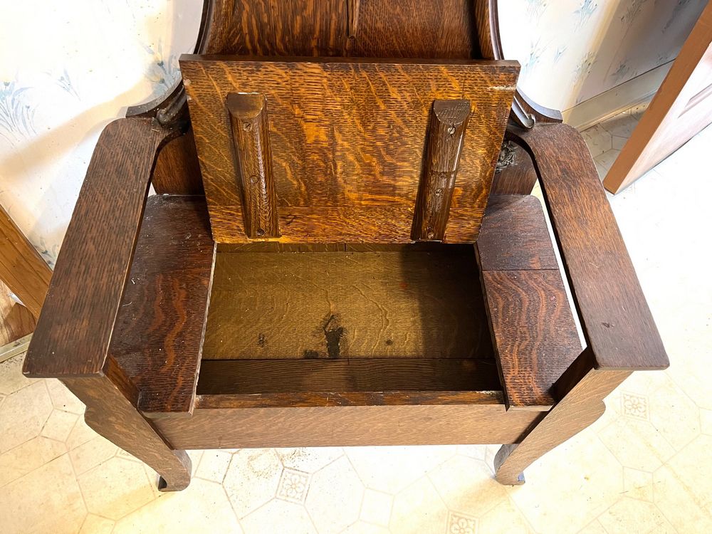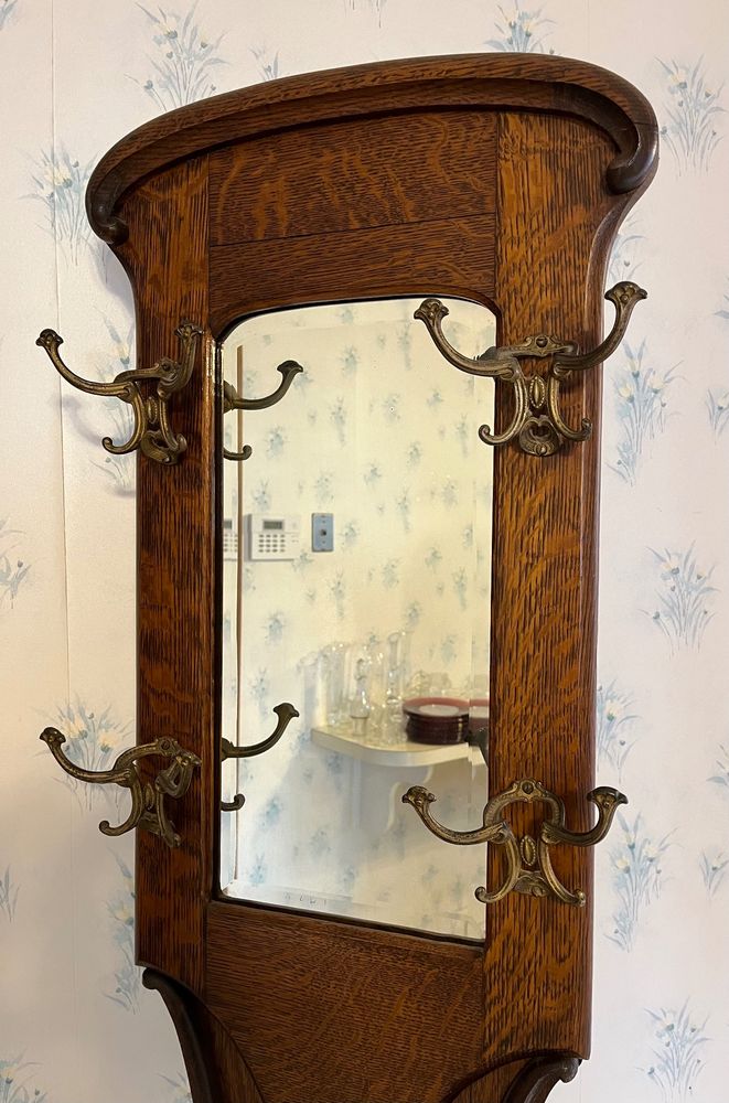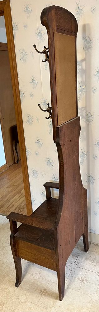Bench Hall Tree. Hickory hall tree with bevel glass mirror, four four-prong coat hooks, storage seat, 26.5"Wx15"Dx74"H (vintage, possibly an antique).