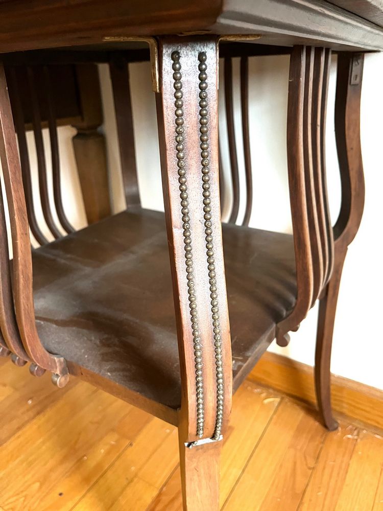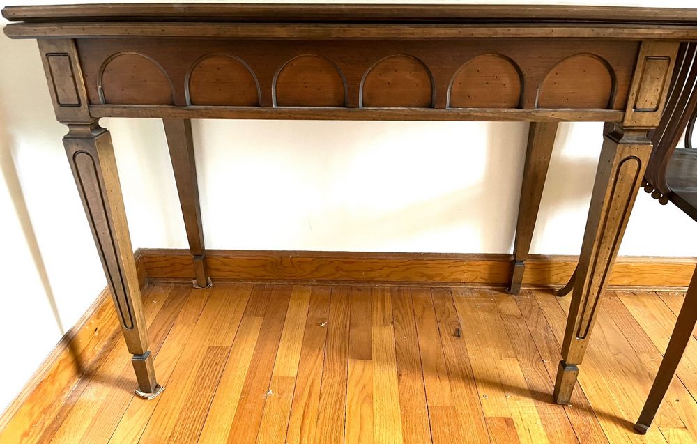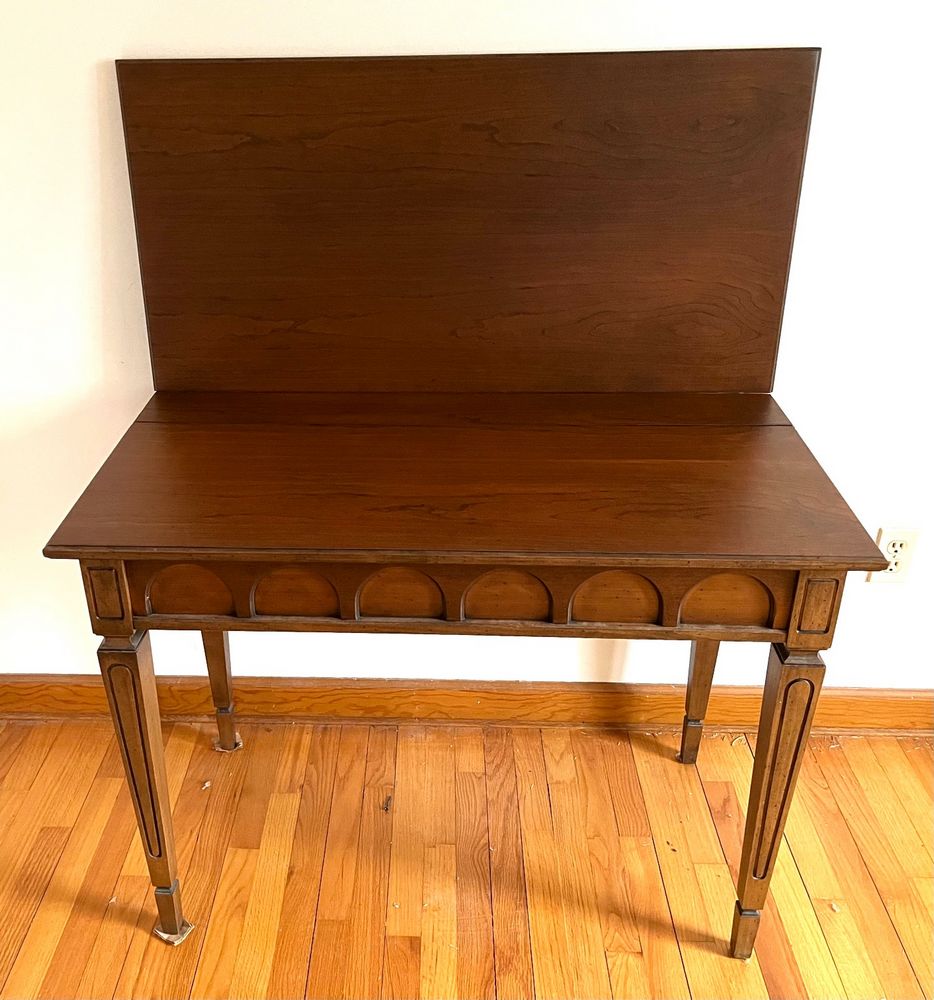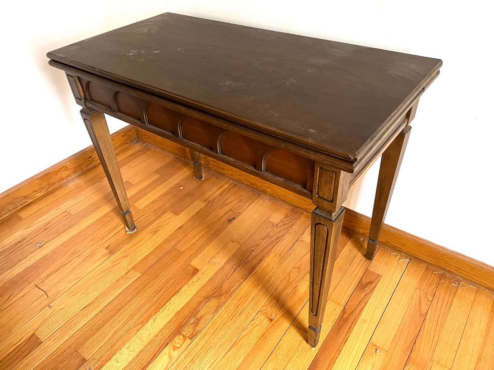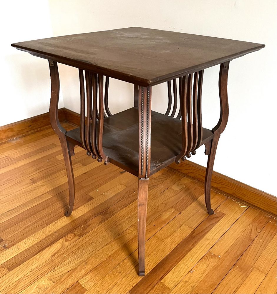 Contemporary Furniture. Hardwood expandable table (no leafs), 40"x20"/40"x30.5"H; hardwood side/lamp table with lyre design & nail head accents, 2'sq x30"H.