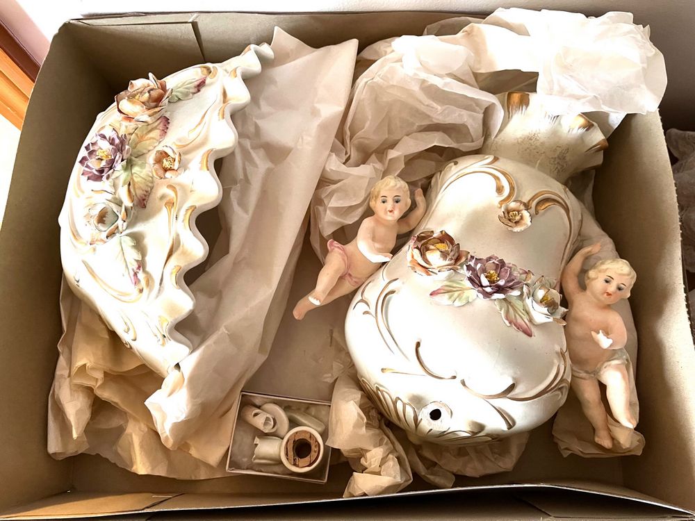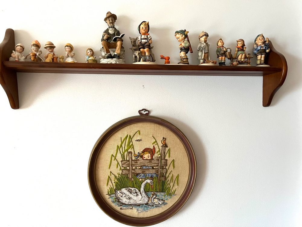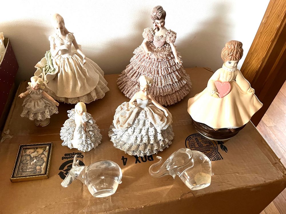 Hummels and other Décor. 11 Hummel figurines, 5.5" to 2.25"H; Spode (?) figurine (man writing in book), 6.5"H; framed Hummel embroidery 13"diam; cherub wall décor (?) (broken, pieces included); five lace porcelain figures, 10" to 4.5"H (very delicate, some minor damage possible); music box (girl with heart), 9"H; two glass Holmegaard figures: donkey 4"W, & elephant 4.5"W. Wall shelf not included