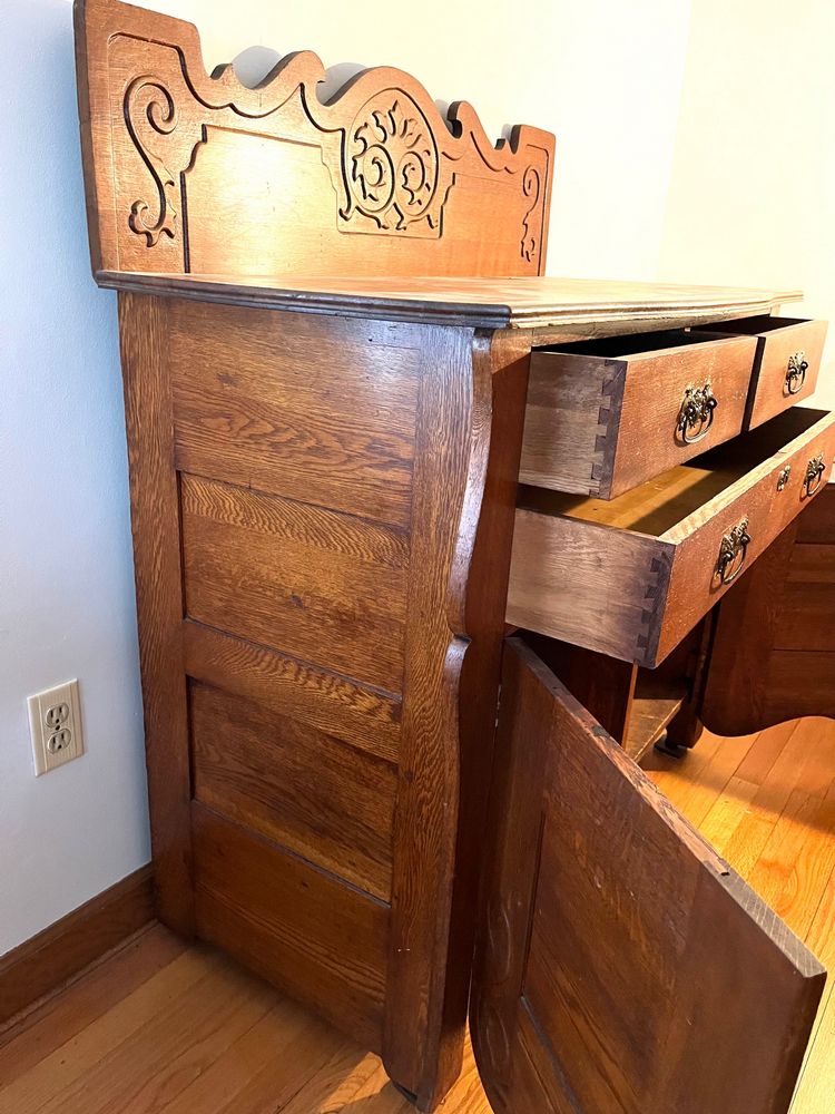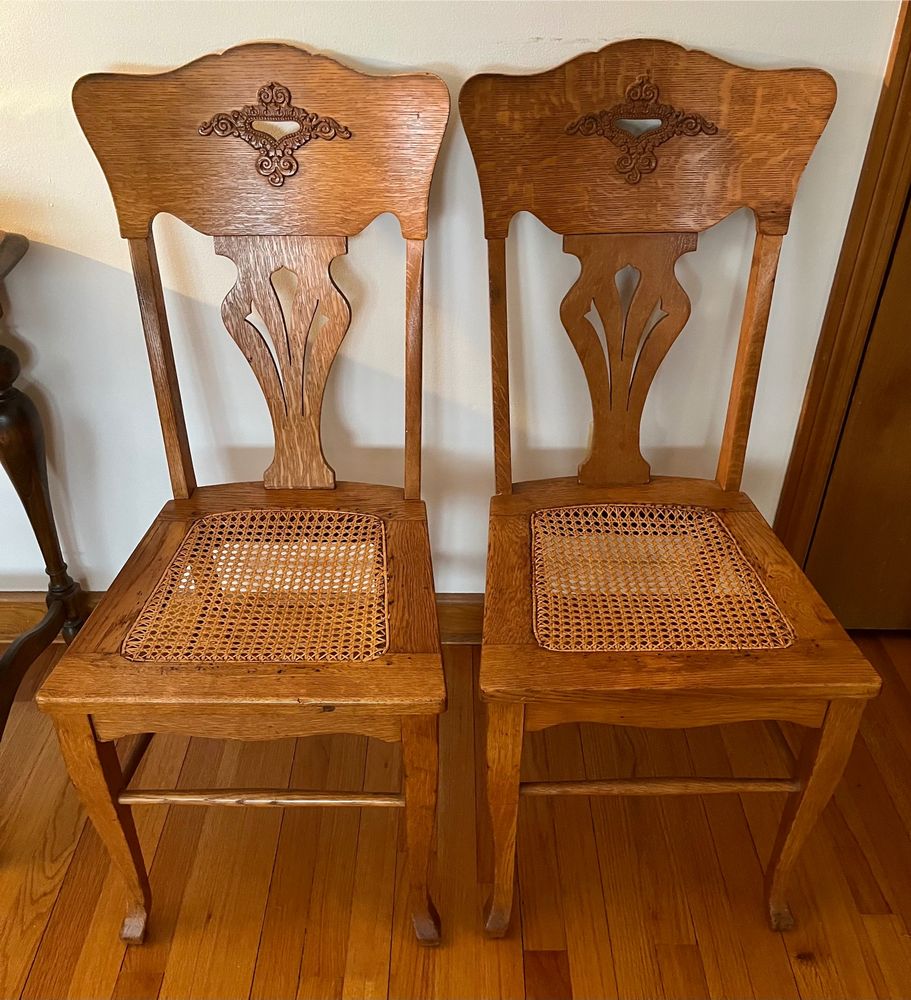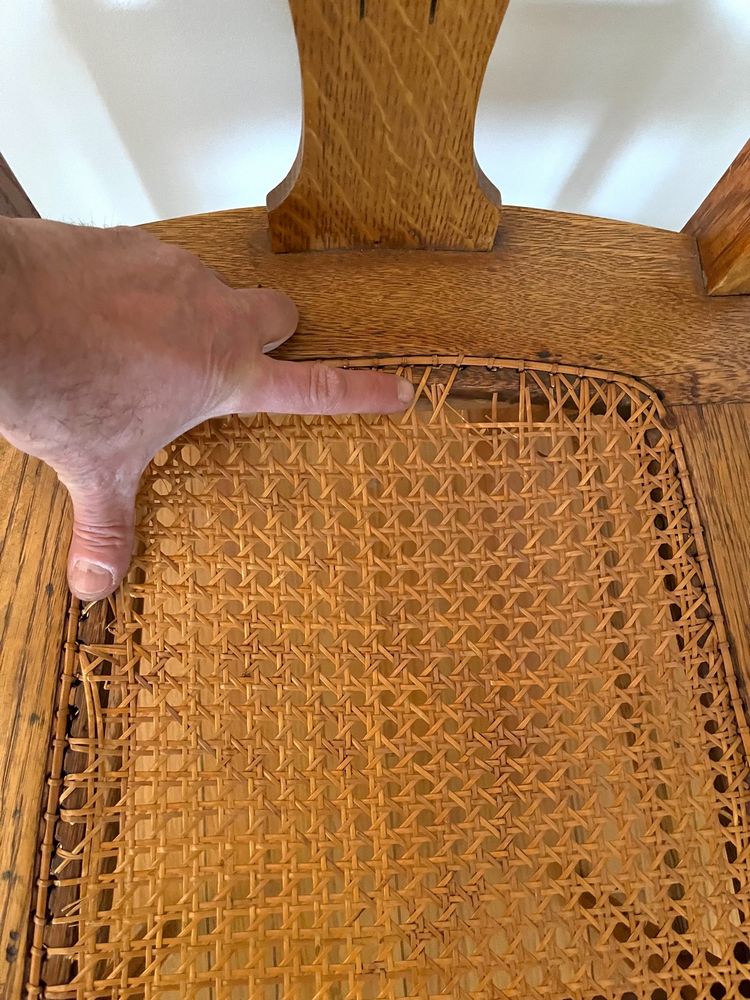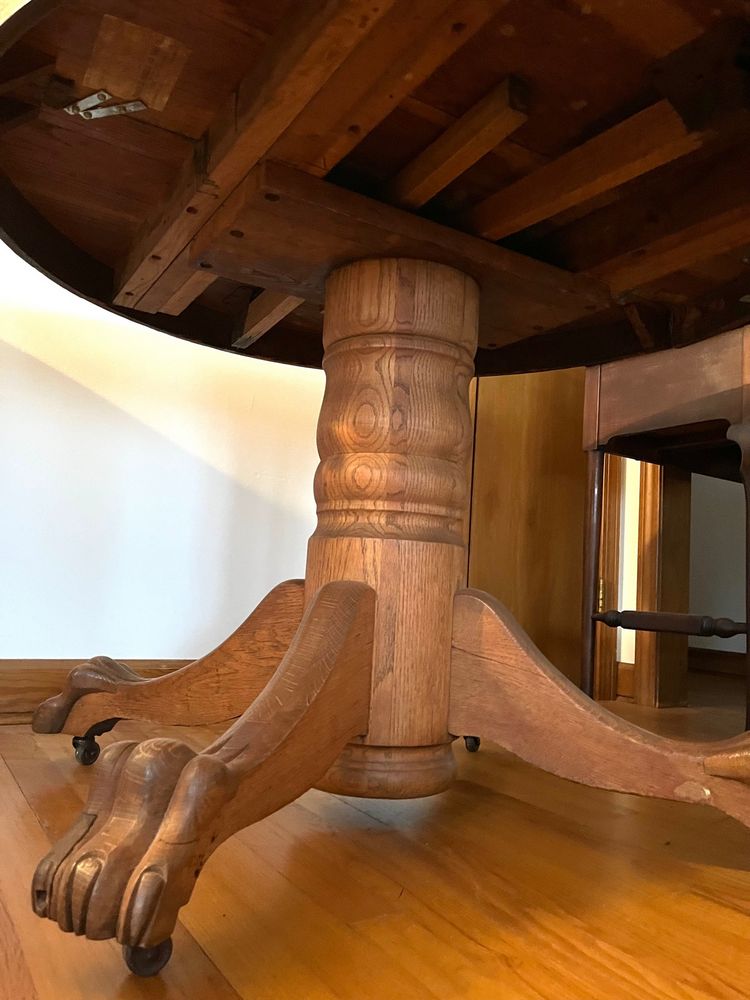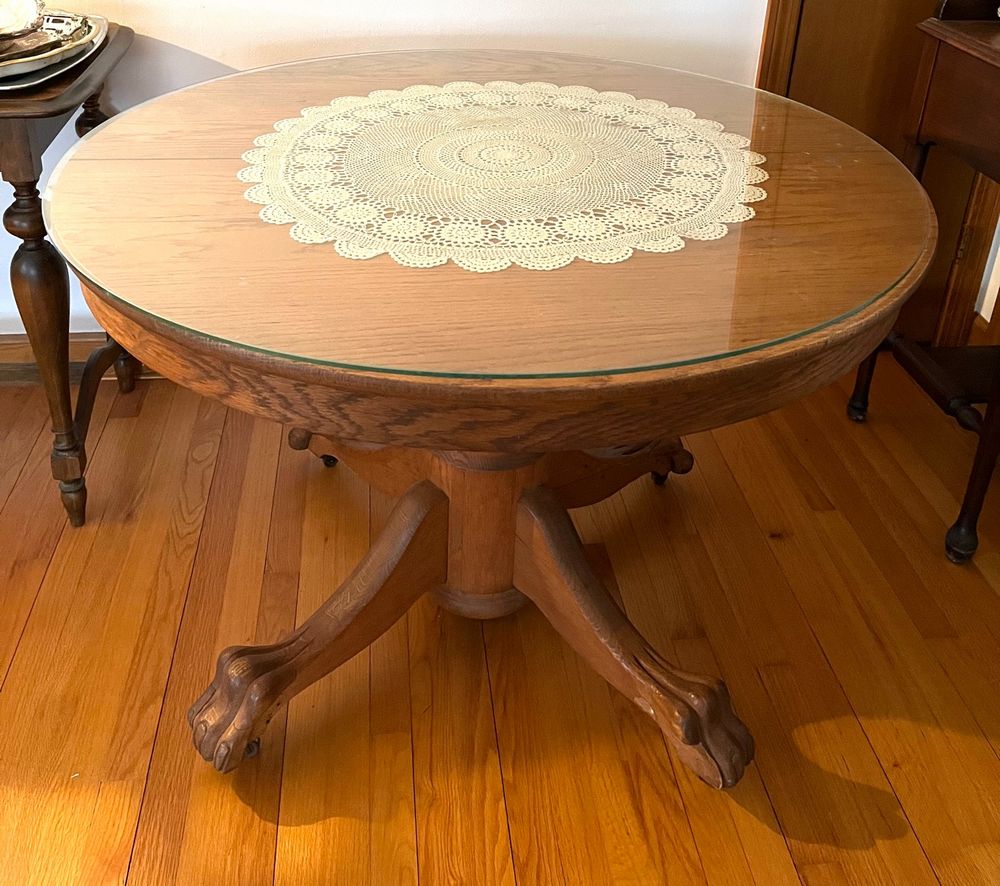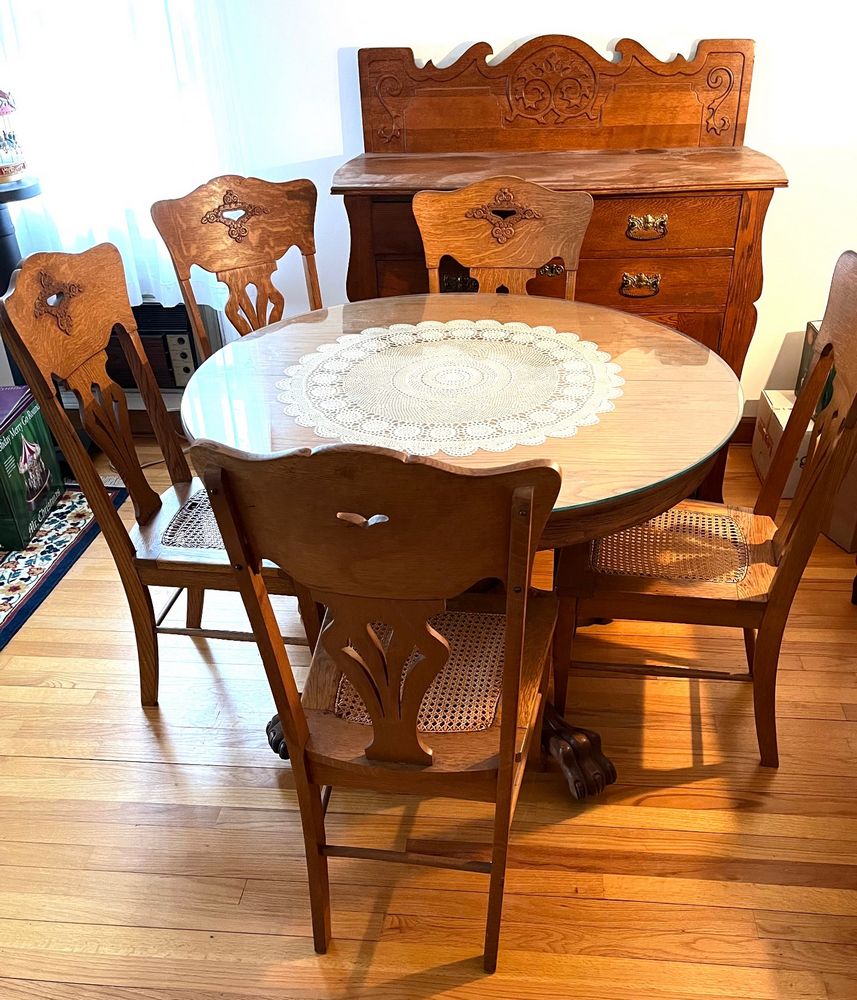 Oak Table Set with Five Chairs and Antique Linen Cabinet. Oak round clawfoot pedestal table on casters with custom glass top, 42"diam x30"H; & five hardwood side chairs with caned seats, ea. 18"Wx20"Dx40"H (one seat with minor damage); antique hickory linen/China cabinet on casters with three dovetailed drawers & two-door cabinet (no key), 47"Wx23"Hx49"H.