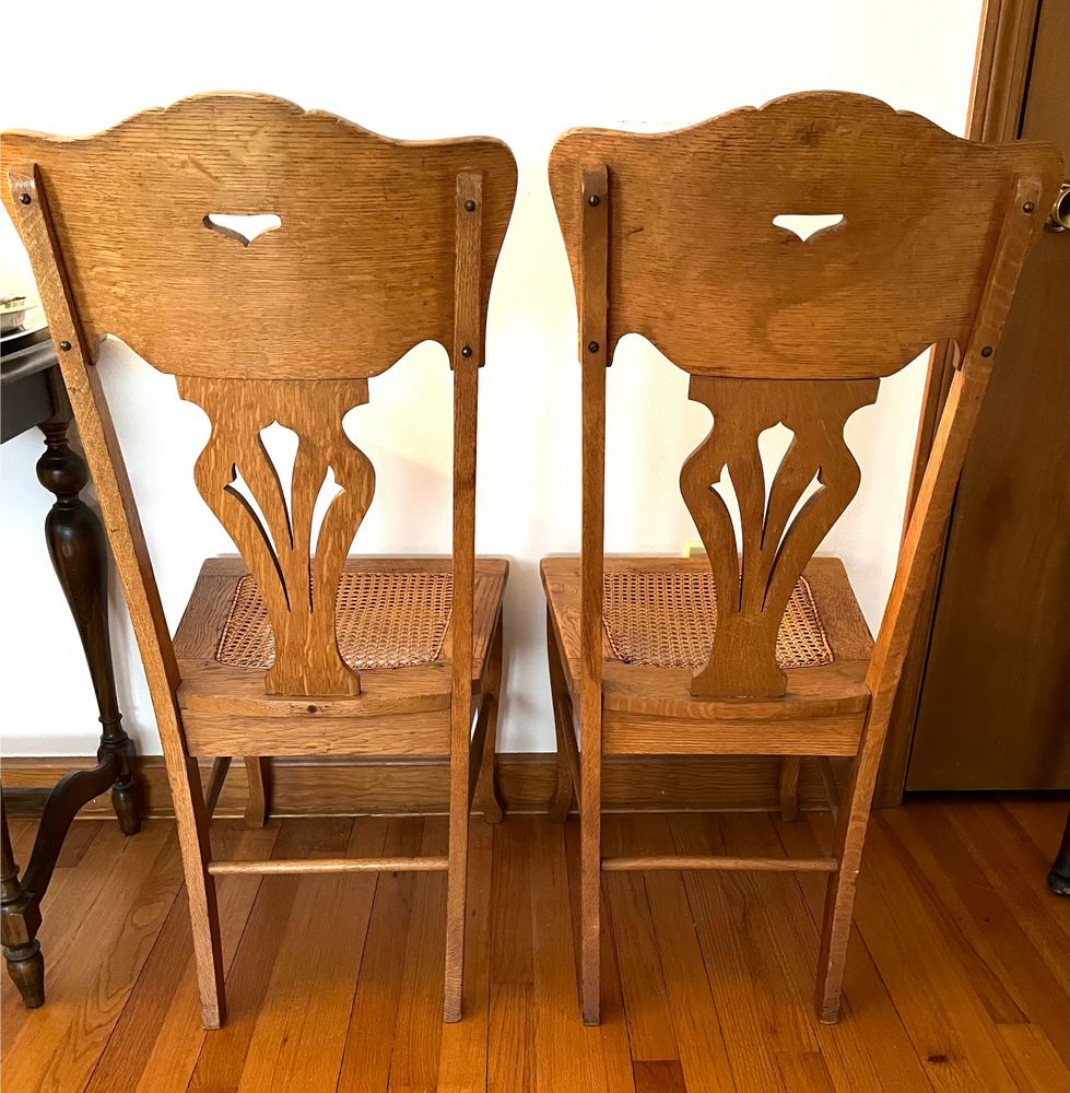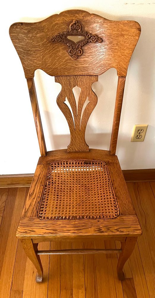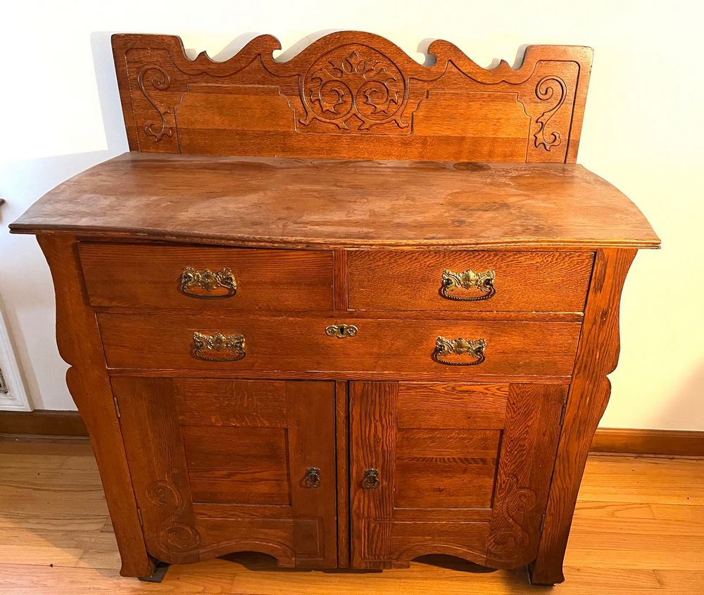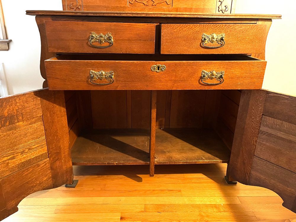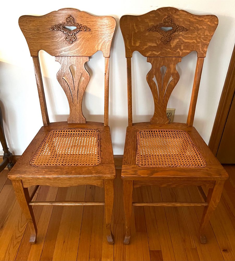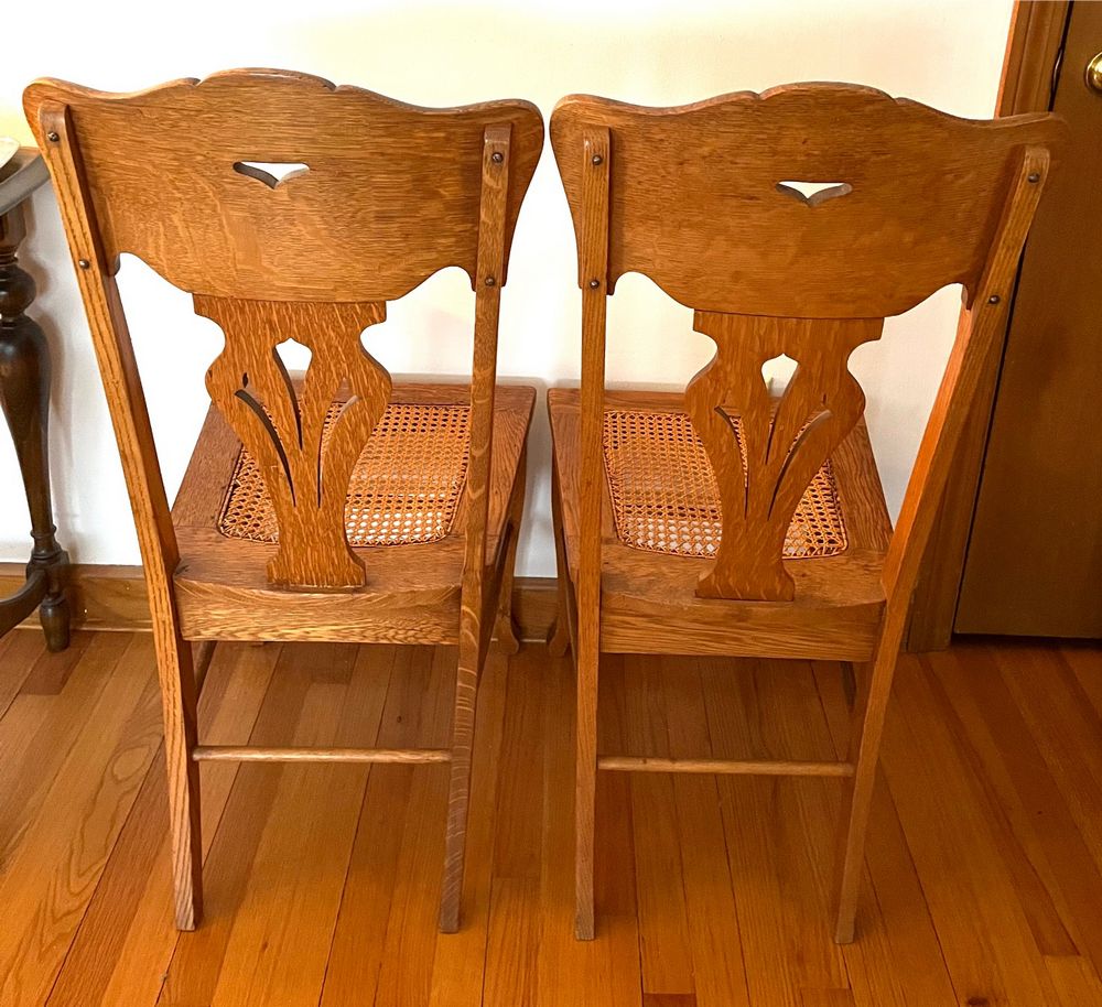 Oak Table Set with Five Chairs and Antique Linen Cabinet. Oak round clawfoot pedestal table on casters with custom glass top, 42"diam x30"H; & five hardwood side chairs with caned seats, ea. 18"Wx20"Dx40"H (one seat with minor damage); antique hickory linen/China cabinet on casters with three dovetailed drawers & two-door cabinet (no key), 47"Wx23"Hx49"H.