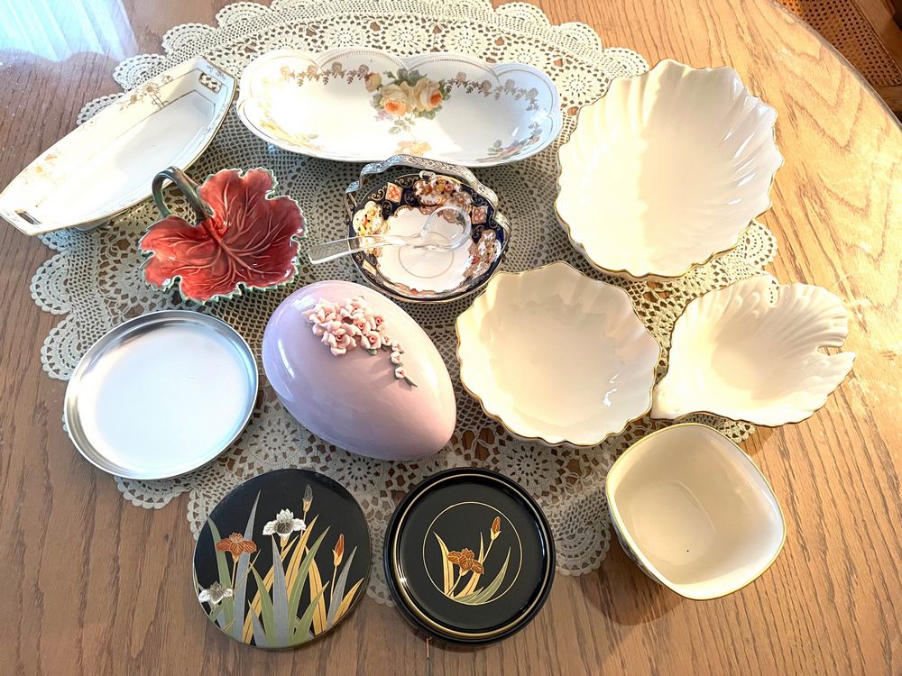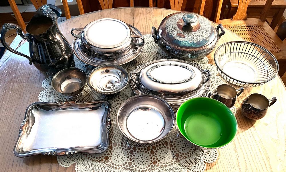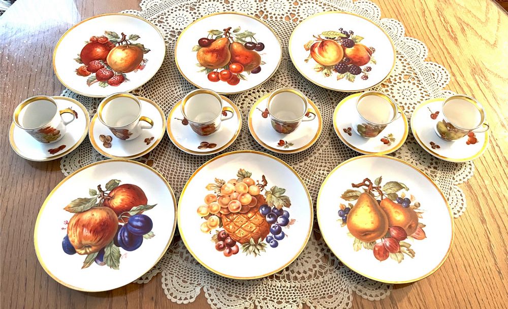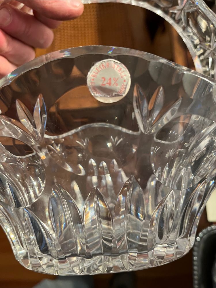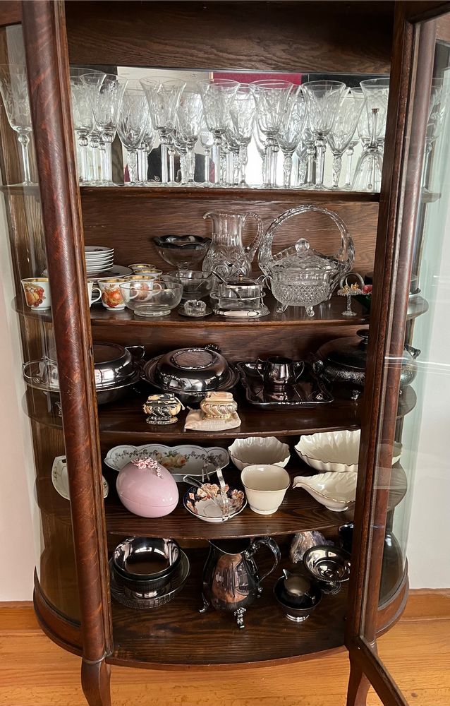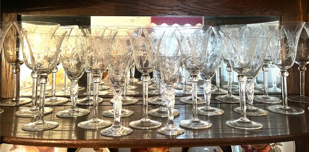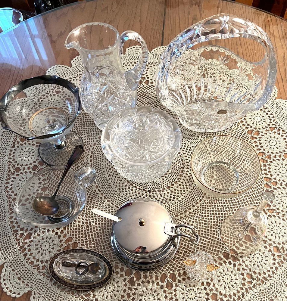 Stemware Set, Entertaining Pieces, and Décor. 25 piece crystal stemware set: 13 goblets, five wine, five sherry, two cordial; Mitterteich 48 fruit motif China set three piece service of six, plate 7.5"diam; silverplate: covered veggie bowl 9" diam x5.5H, creamer & sugar, two candy dishes, oval covered bowl 11"x8.28", rectangle tray 10.5"x7.5", pitcher 9"H, Gorham EP bowl 16779 6.5"diam x3"H, Reed & Barton green-lined bowl 1120 6.5"diam x3.25"H, two Ronson wtd cigarette lighters 3"W; Lenox fluted bowls oval 11"x7" & round 6"diam, dove 8"L, & bowl 4.25"sq x3"H; Royal Albert condiment pot with glass ladle; German-made oblong dish 1'x5.5"; Nippon oblong dish 9"x4.25"; Bleikristall 24% lead crystal basket, 8,5"Wx8"H; crystal (?) pitcher, 7.25"H; cut glass covered candy dish, 5.5"diam x6"H; silver trimmed pedestal candy dish, 5.5"diam x5"H; other related items as in photos. Curio not incl.