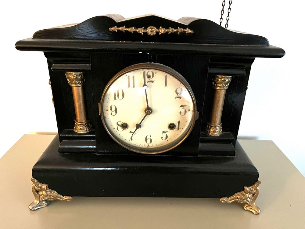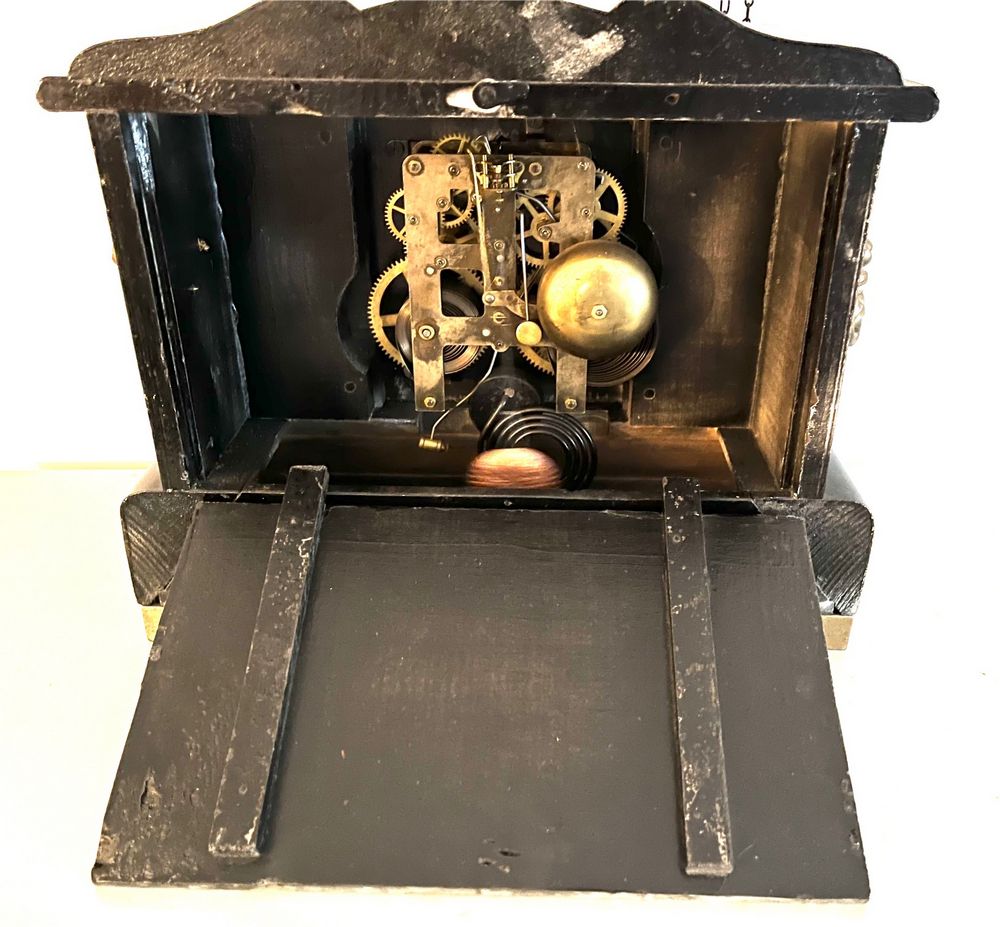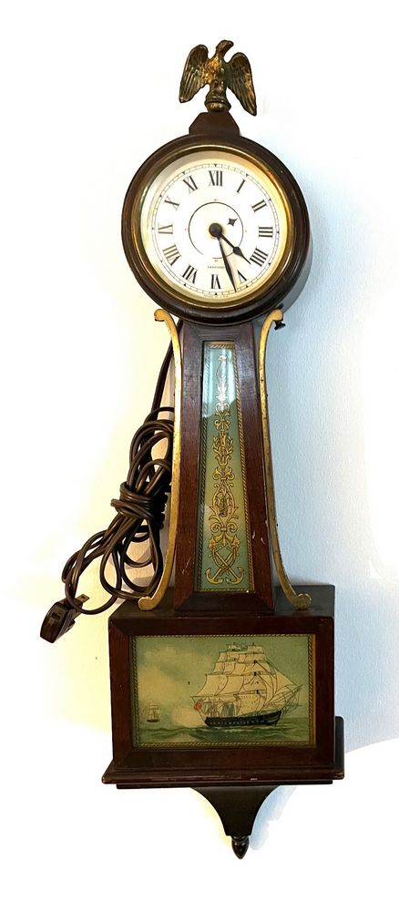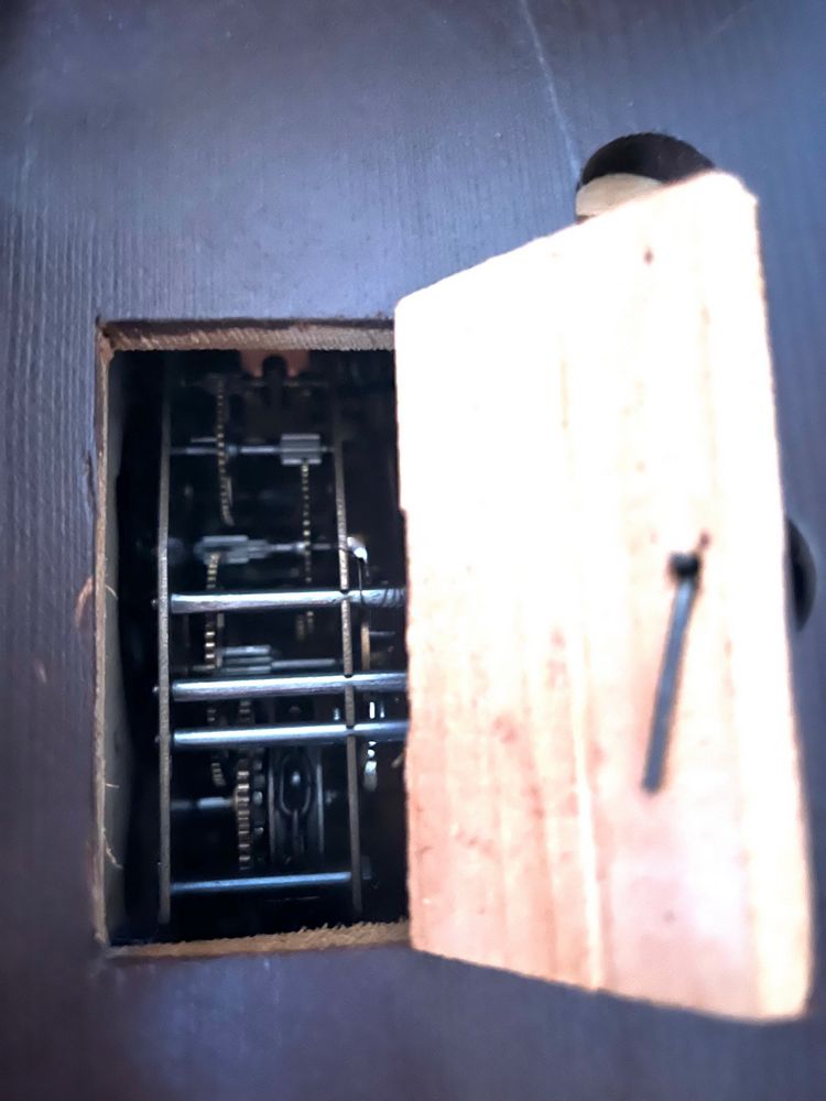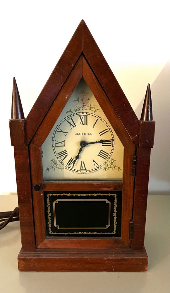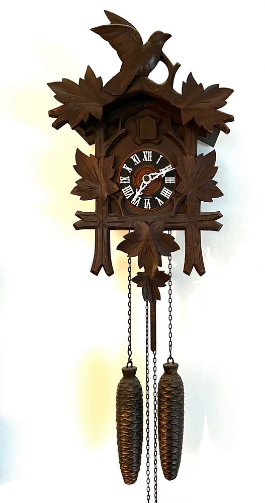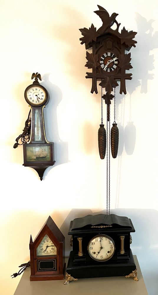 Clocks. Four clocks: Cuckoo clock, 11"Wx28"H (as photo'd with pinecone weights); Sangamo electrified banjo clock, 6.5"Wx2'H, 3.5"diam dial; Waterbury Clock Co mantle clock, 14"Wx6"Dx1'H (no key); Sentinel electrified church clock, 7"Wx4"Dx1'H, 3.25"diam dial.