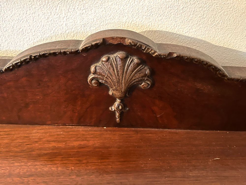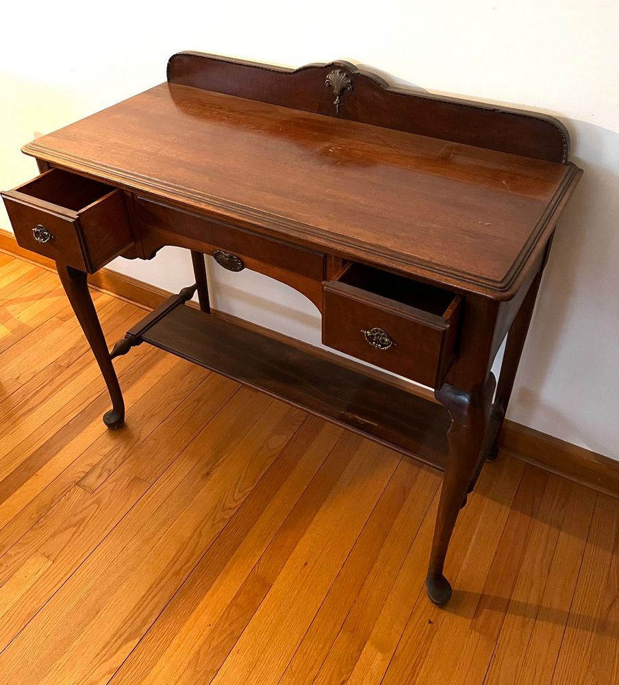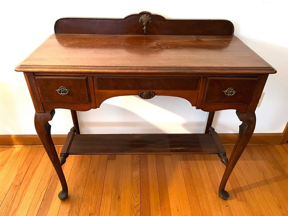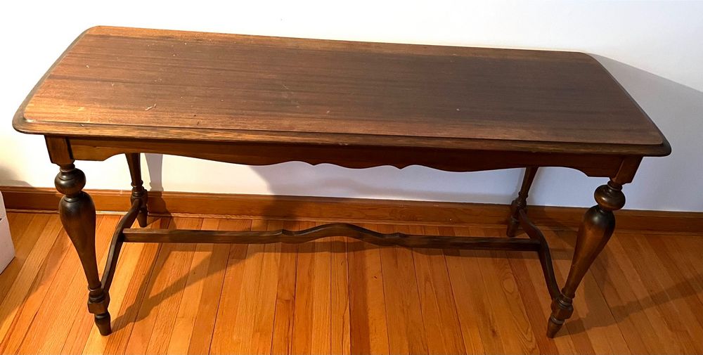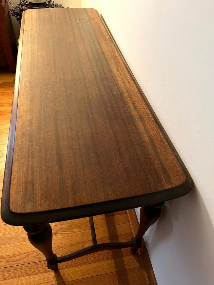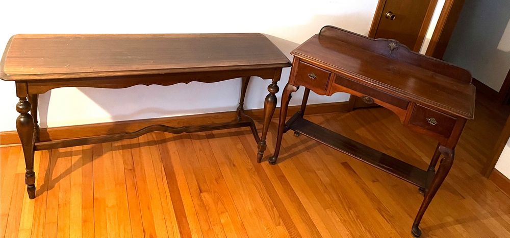 Sofa Table and Sideboard. Mahogany trestle sofa table, 5'Wx20"Dx30.5"H; mahogany Queen Anne sideboard with two dovetailed drawers, 40"Wx18"Dx38"H.