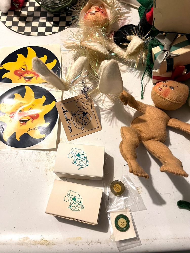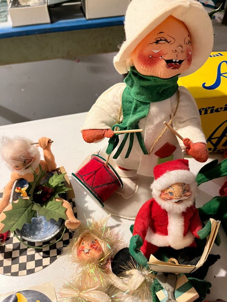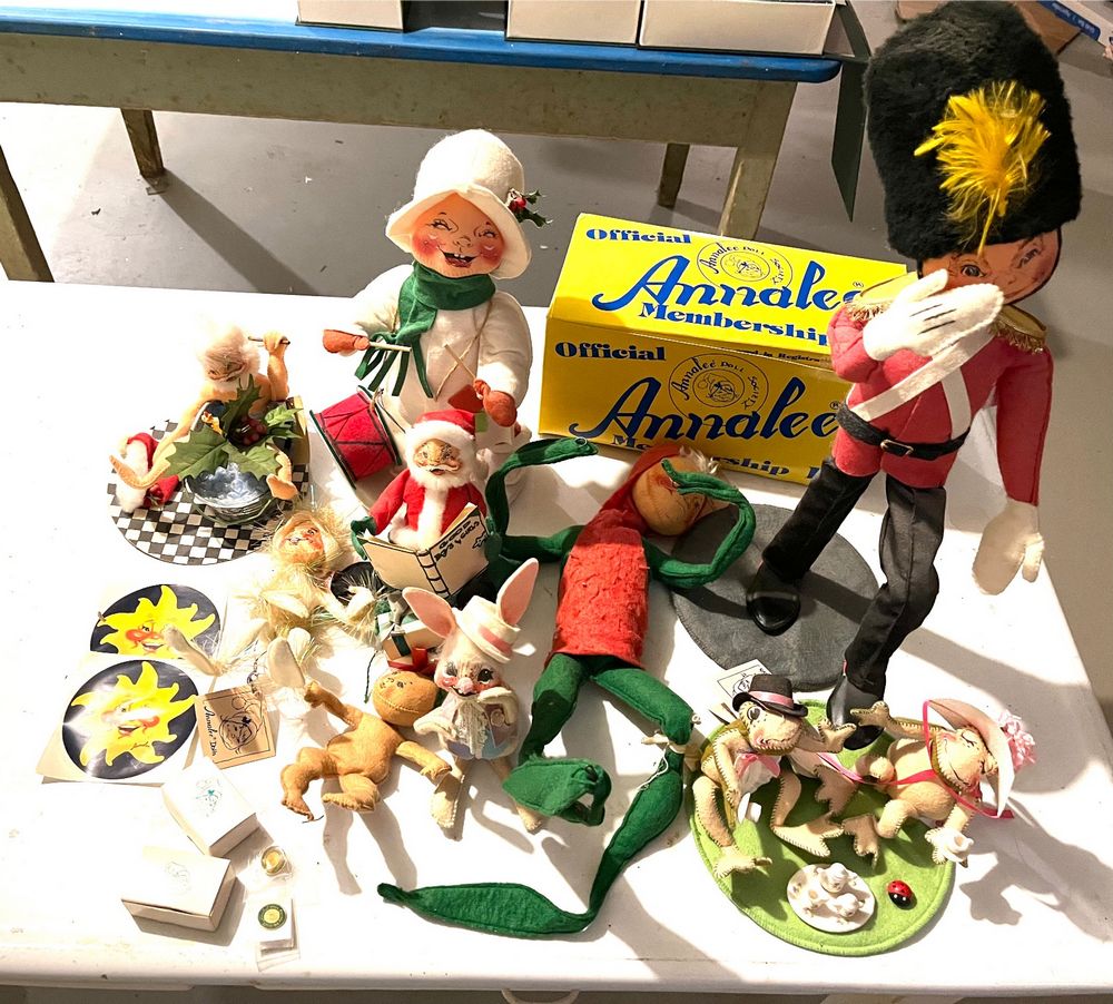 Annalee Dolls. 9 Annalee dolls with starter set box (empty), two pins, & two decals. See photos for details. Located in the basement.