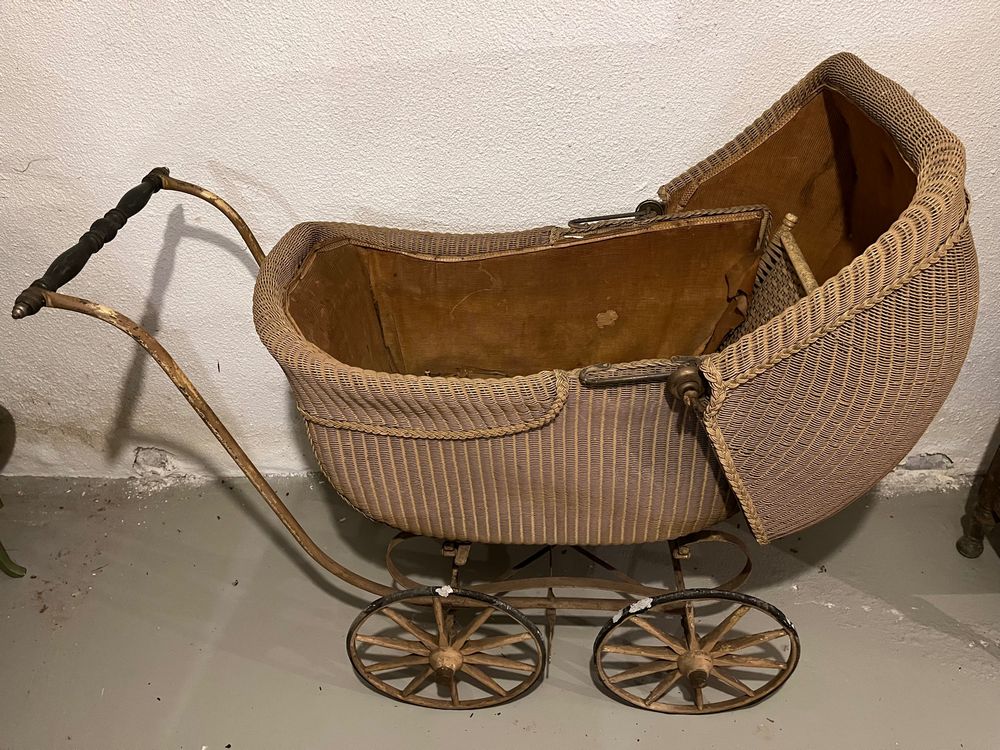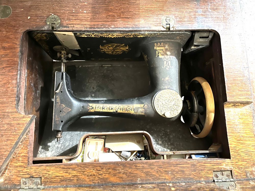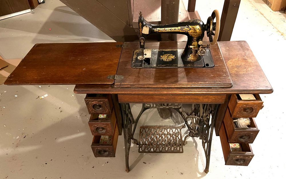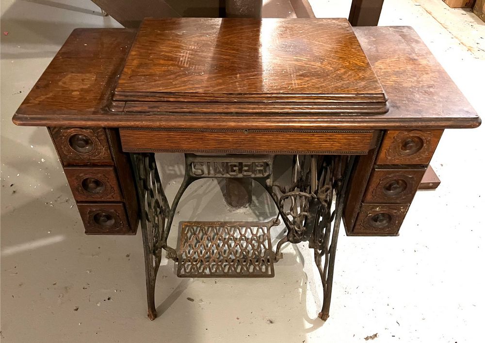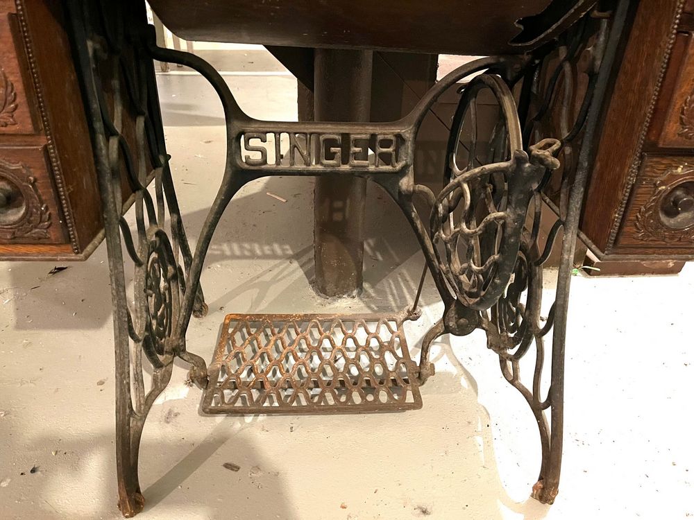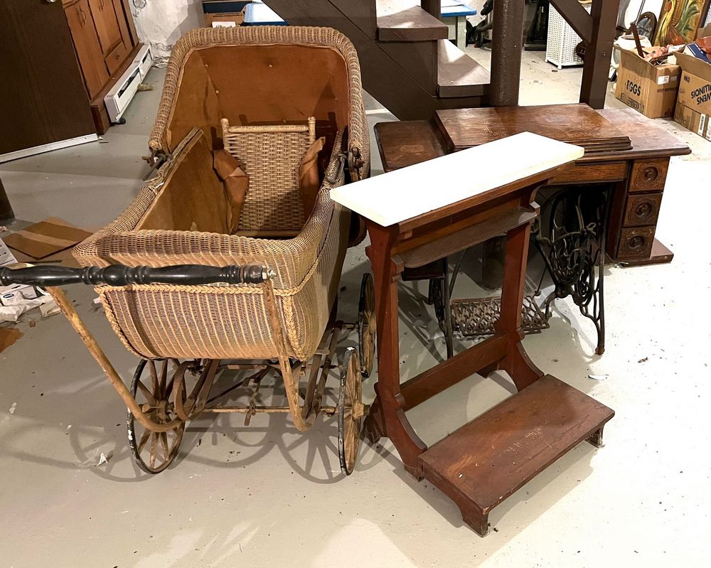 Antique Baby Carriage, Sewing Machine, and Prayer Kneeler. Antique wicker baby carriage with canopy, 43"/49"L x2'Dx46"H (good condition, corduroy liner needs minor repair); antique treadle-op singer sewing machine in drop-down hickory cabinet, 3'/50"Wx18.5"Dx31"H (no belt), with notions; hardwood prayer kneeler, 23"Wx21.5"Dx32"H, marble slab on top not original, 26"Wx8"D. Located in the basement.