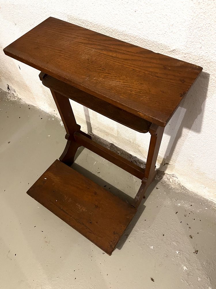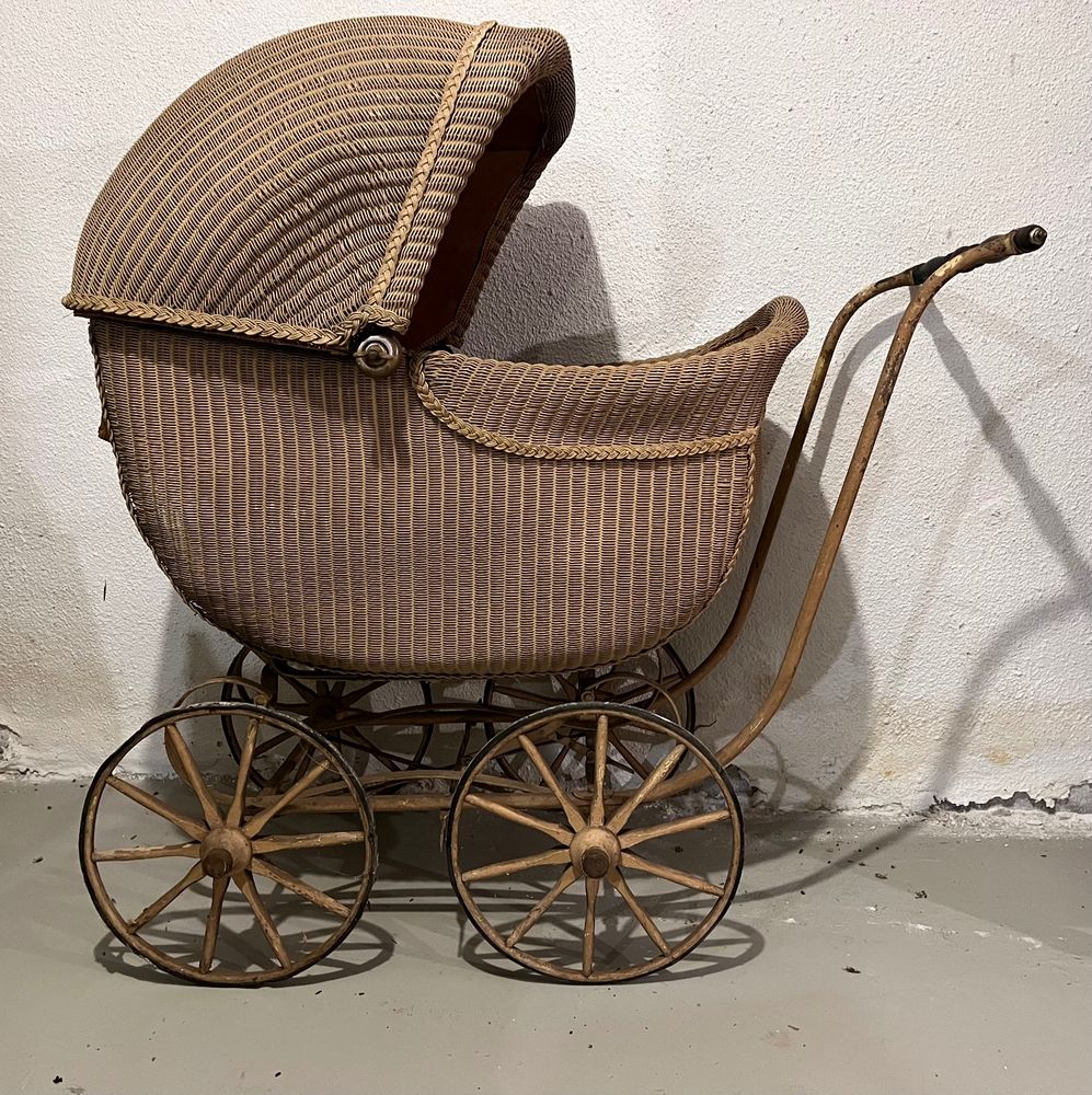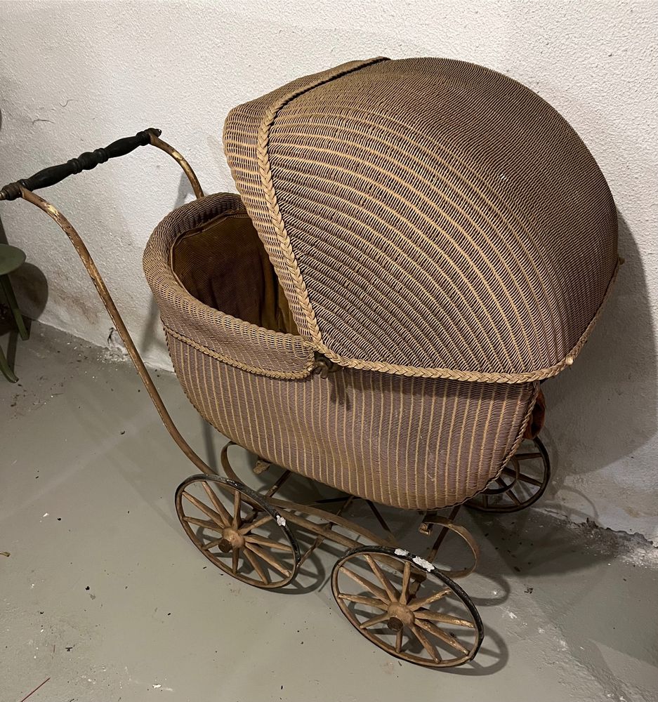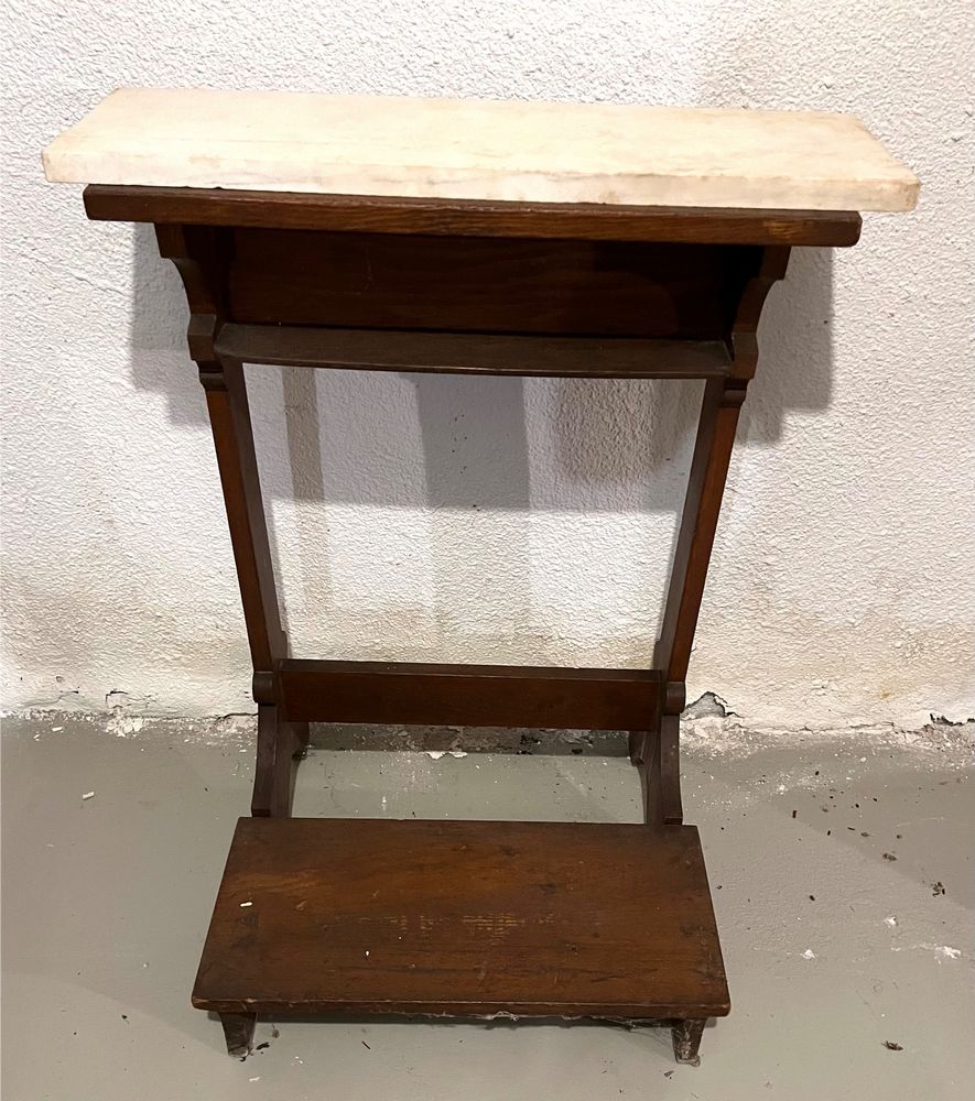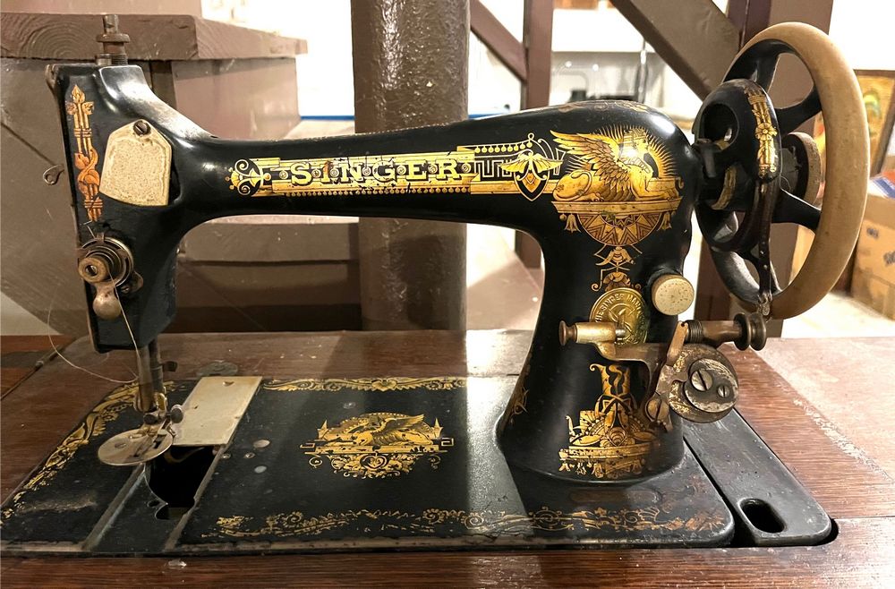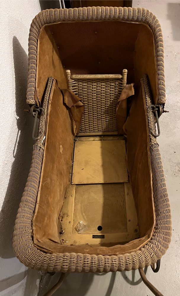 Antique Baby Carriage, Sewing Machine, and Prayer Kneeler. Antique wicker baby carriage with canopy, 43"/49"L x2'Dx46"H (good condition, corduroy liner needs minor repair); antique treadle-op singer sewing machine in drop-down hickory cabinet, 3'/50"Wx18.5"Dx31"H (no belt), with notions; hardwood prayer kneeler, 23"Wx21.5"Dx32"H, marble slab on top not original, 26"Wx8"D. Located in the basement.