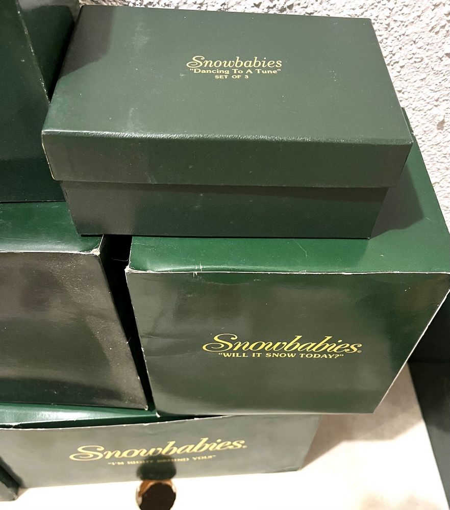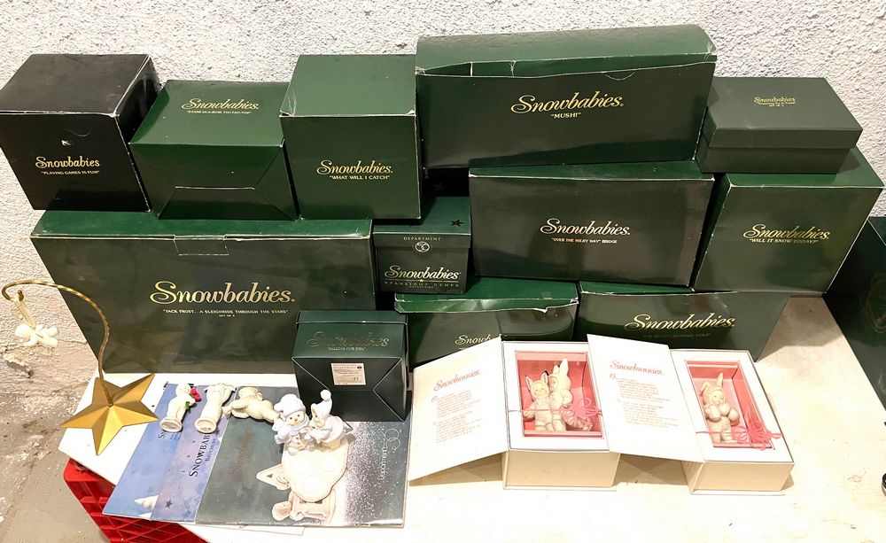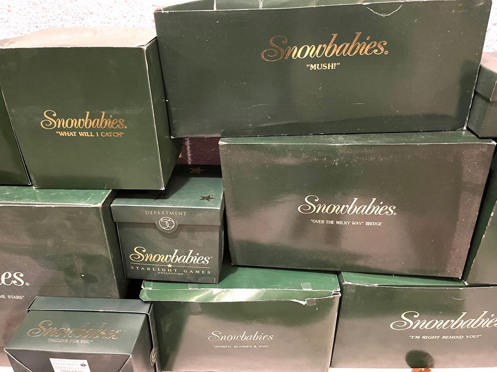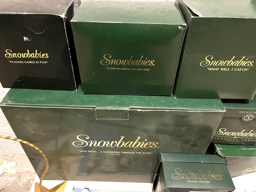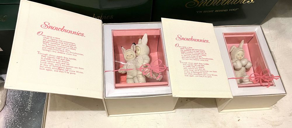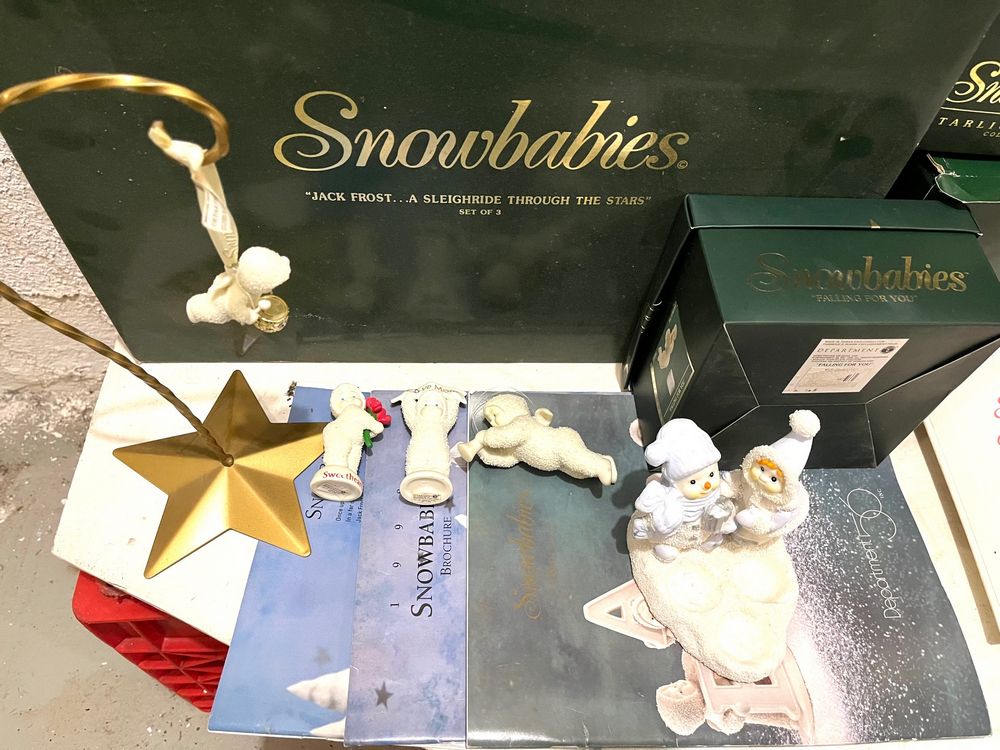Dept 56 Snowbabies and Snowbunnies. Dept 56 Snowbaby figurines, 12 in boxes + five loose (one on star hanger); two Snowbunny figurines in boxes. See boxes in photos for models. Located in the basement.