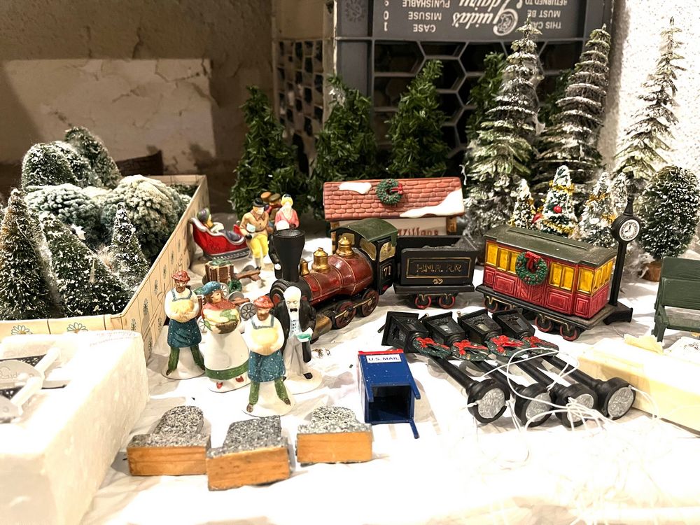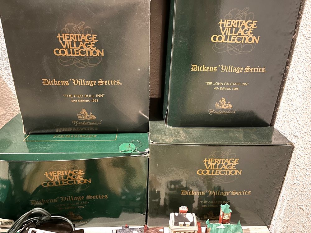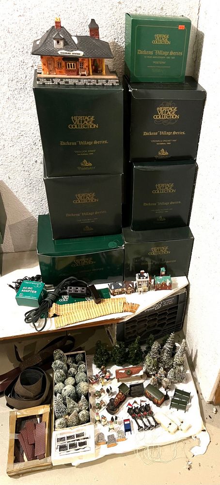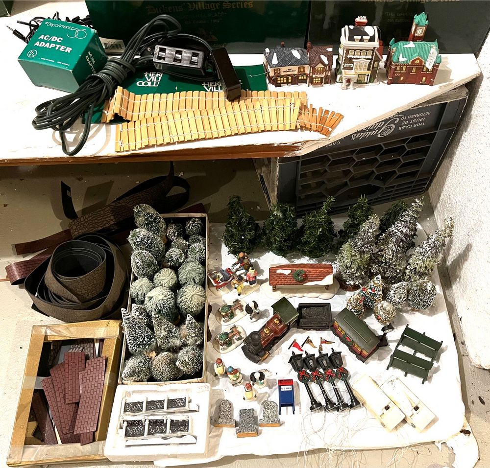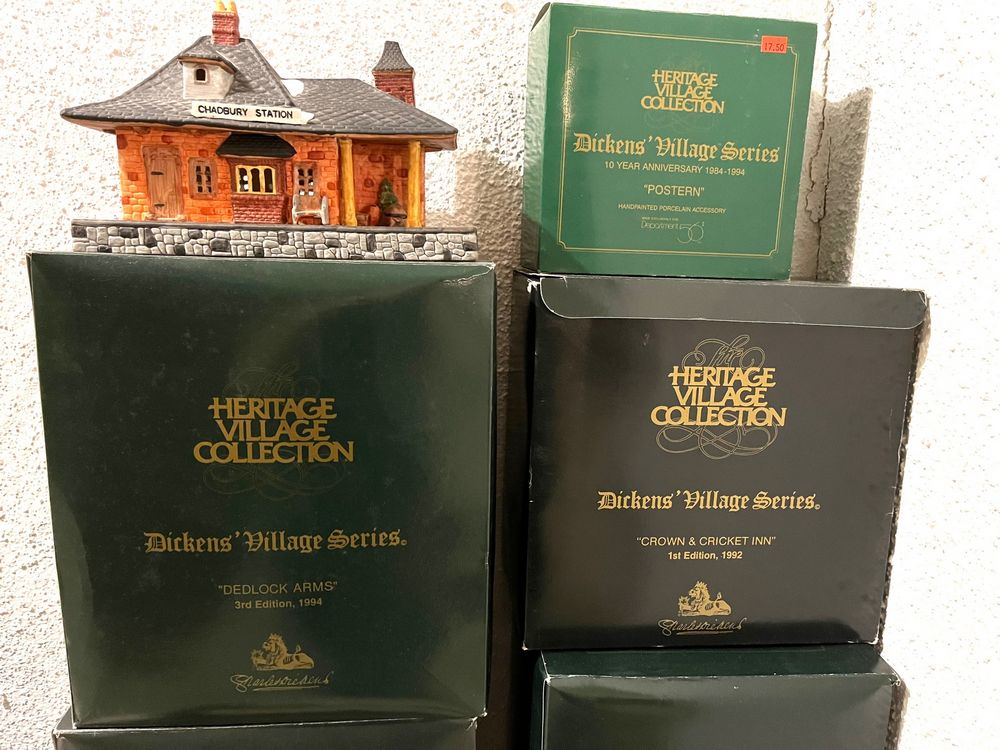 Dept 56 Dickens Village. Seven Dept 56 Dickens Village buildings, in boxes (see photos for models), & Chadbury Station (no box); also, three ornaments & assort accessories. See photos for details. Located in the basement.