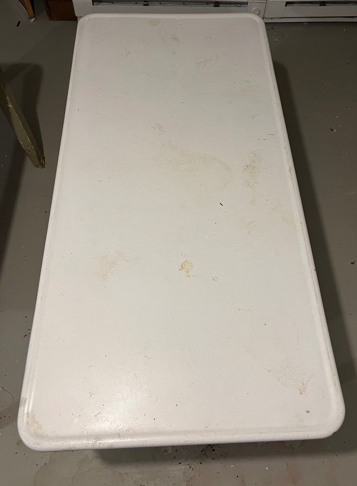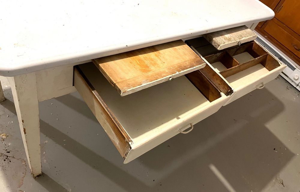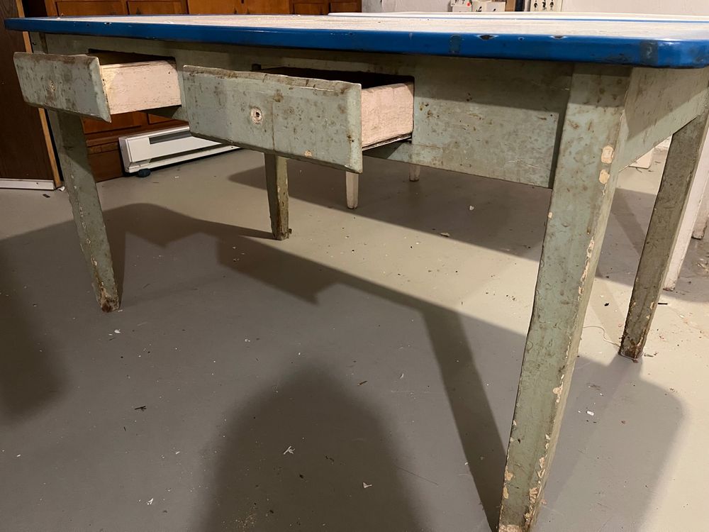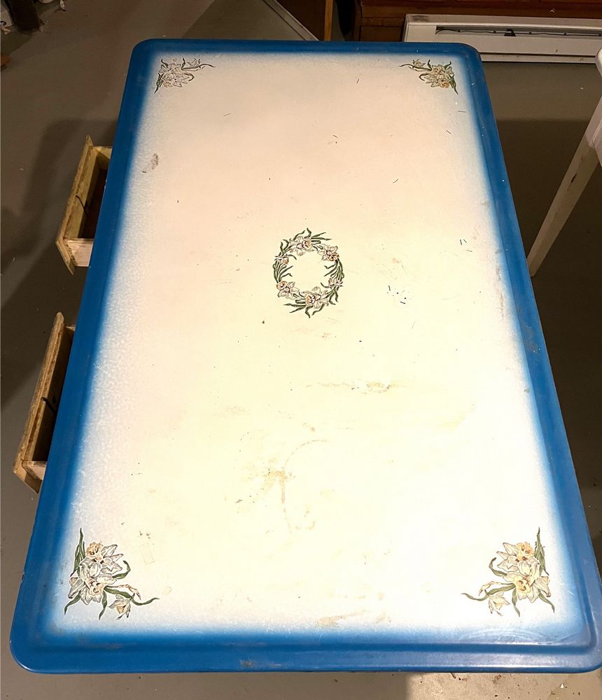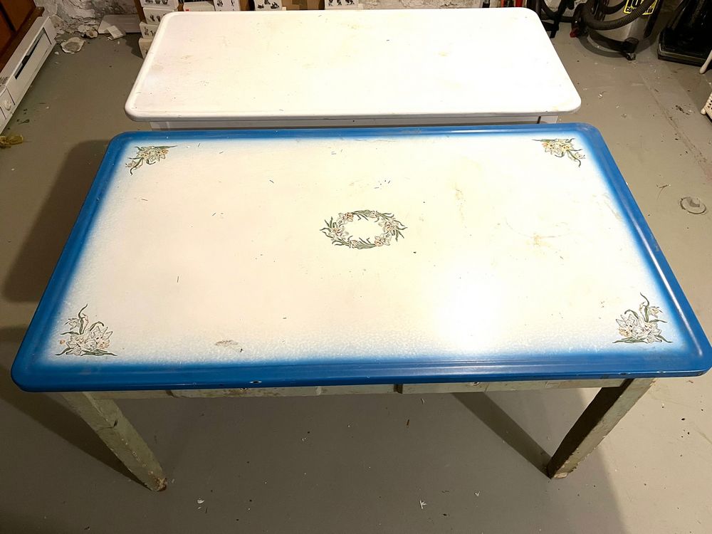 Two Vintage Metal Tables. Two metal-top wood-base tables: blue & floral trimmed with two dovetailed drawers & two slide-out cutting boards/trays, 56"x27"x30"H; white with two drawers (no knobs), 56"x33"x30"H. Located in the basement.