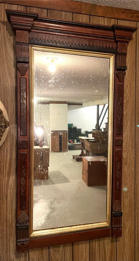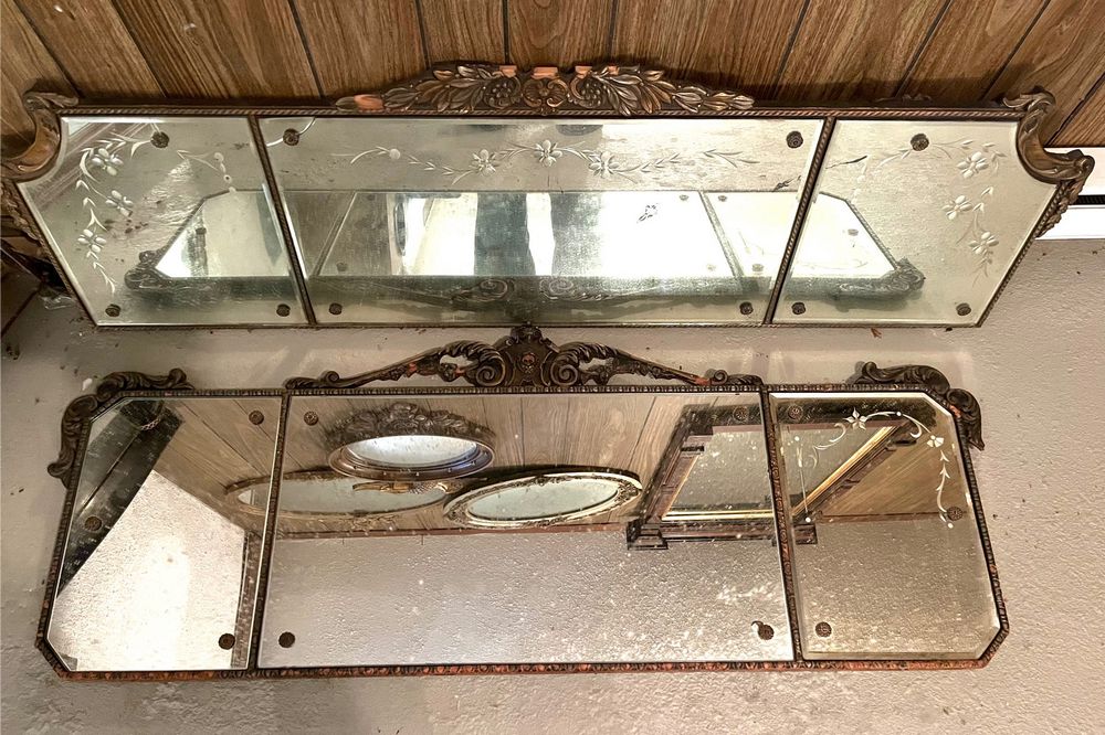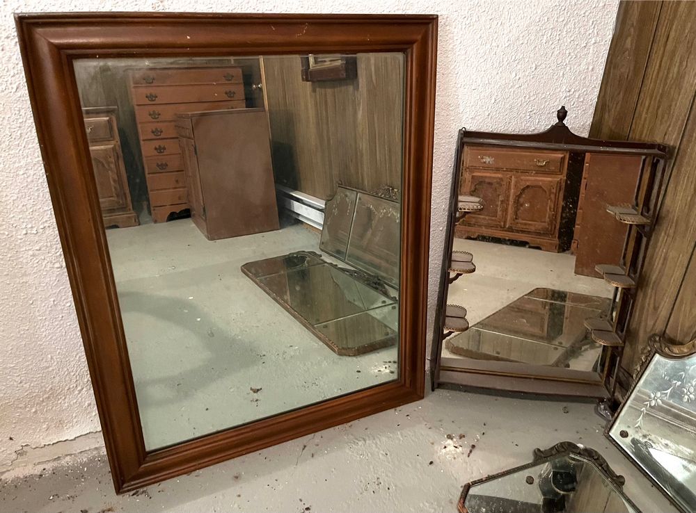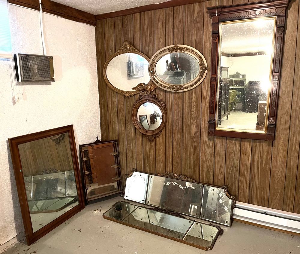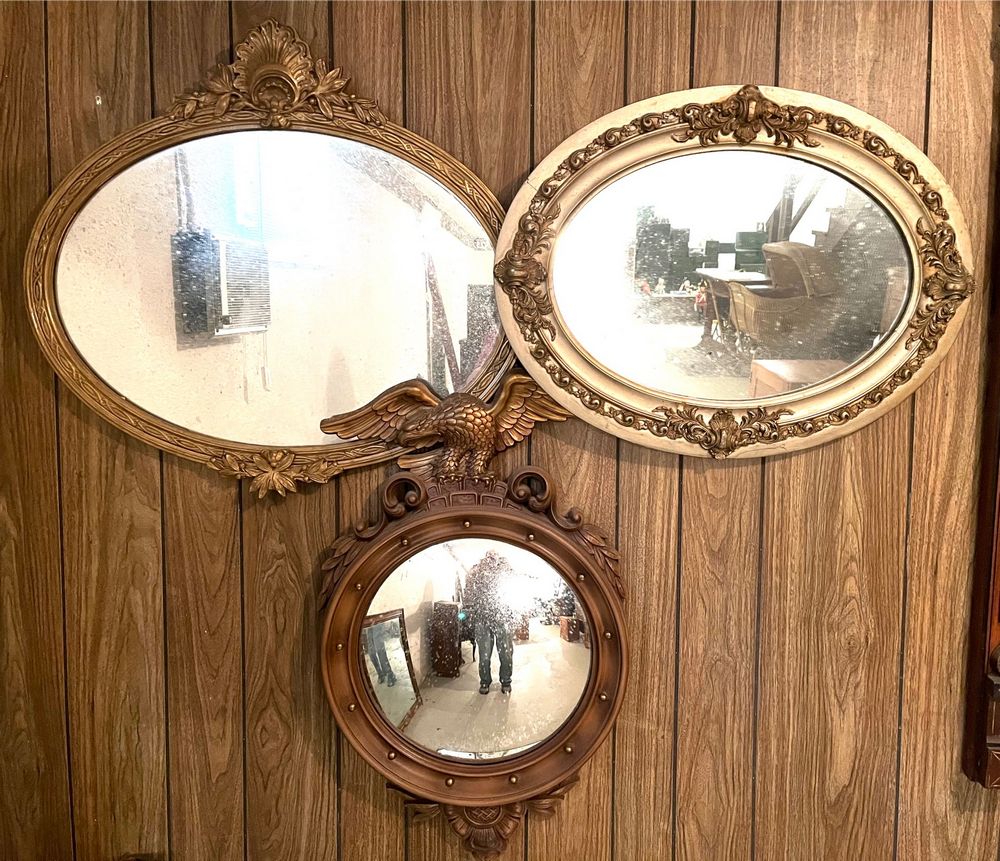Mirrors. 8 mirrors: dresser mirror, 39.5"Wx31.25"H; display with 6 mini shelves, 19"Wx3.5"Dx34"H; two gilt ovals, 28"Wx25"H & 25"Wx19"H (second with minor frame damage); eagle round fisheye, 17"diam, 28"H overall; mahogany entry mirror, 2'Wx4'H; two three-panel mirrors: three etched panes 53"Wx17"H, & one etched two plain panes 50"Wx19.5"H. Located in the basement.