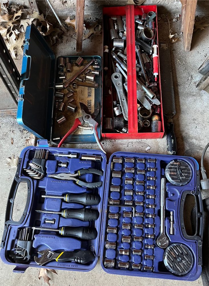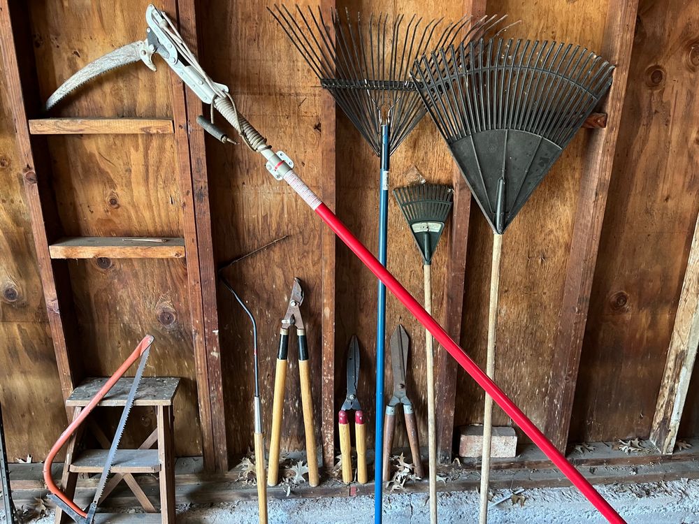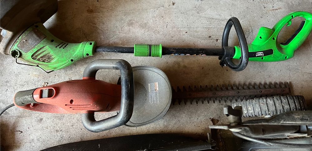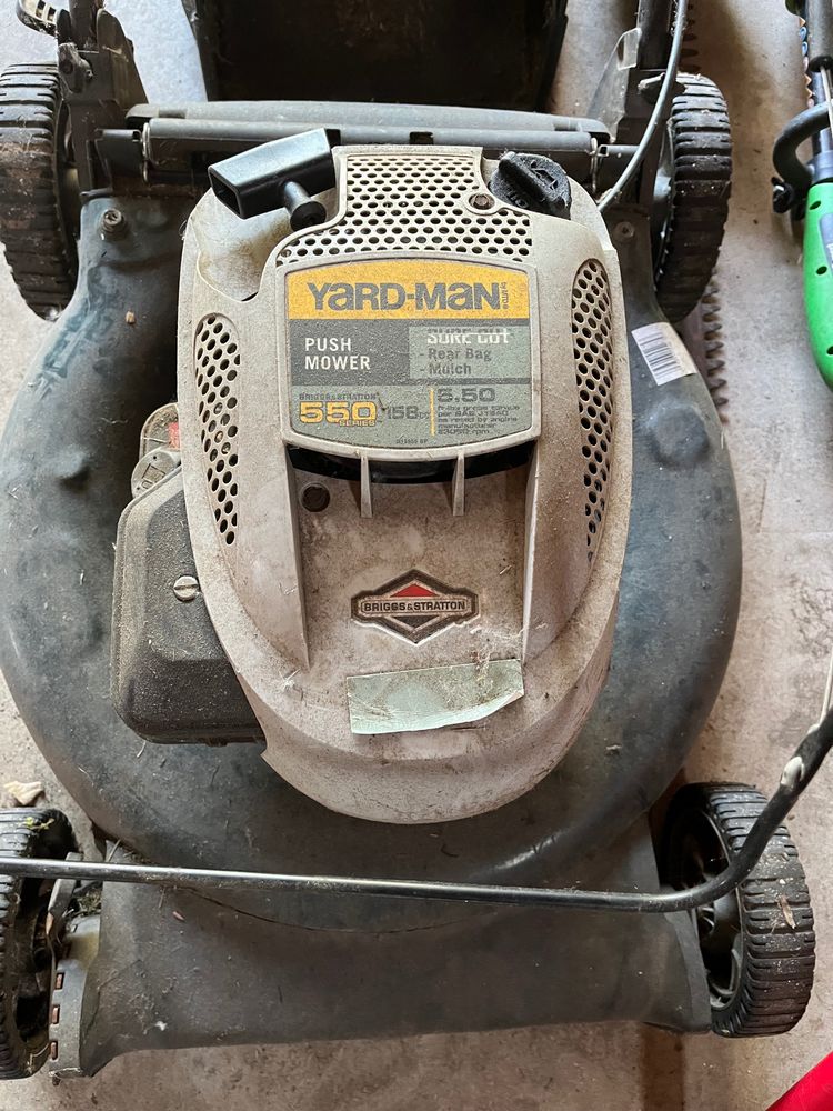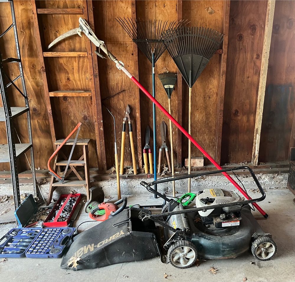 Yard Tools and Mower. Yard Man 550 push mower with bag attach; B&D 22" electric hedge trimmer HT2200; Expert Gardiner 13" electric string trimmer 10254EG; complete Garage Tool Set in carry case (new); pole saw, bow saw, loppers, two manual hedge trimmers, three leaf rakes, manual week wacker, wood step stool, assort socks; other tools as in photos.