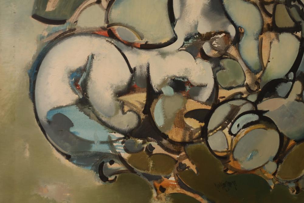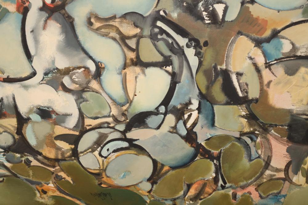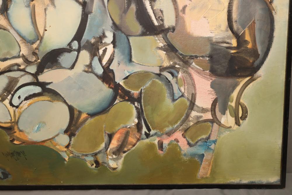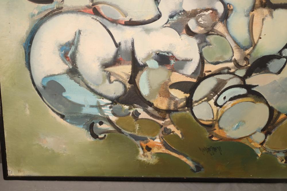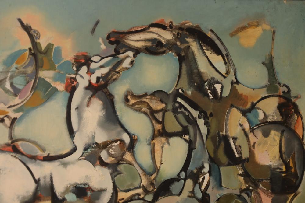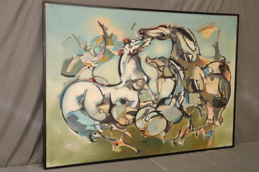 Items includes artwork: Oil on framed canvas, abstract art. Title on back "Night Cometh"; Oil on canvas, abstract art. Title on back "Far Edge". Signature on front appears to read "Syd Weinstein"; Oil on Canvas, abstract herd of horses. Signed in middle of painting. Written on back "Les Affectueux - II 1998"; Oil on canvas framed. Aquatic ship scene; Color etching and aquatint on paper. Titled "Sound of a Forest Brook" Signed lower right " Karl Schrag 86' " numbered 7/40; Print on paper framed. Signed "Amen" in lower right corner. Lower left reads "AP The City" ; Mixed Media Collage on paper. Signed lower left corner "William McGee 1989" Title "By the Sea"; Two framed Egyptian prints on Papyrus. "Nefertari and Hathor" and "Ramsess II Moving into Battle" and much more! Items are located in Pleasant Valley, NY.