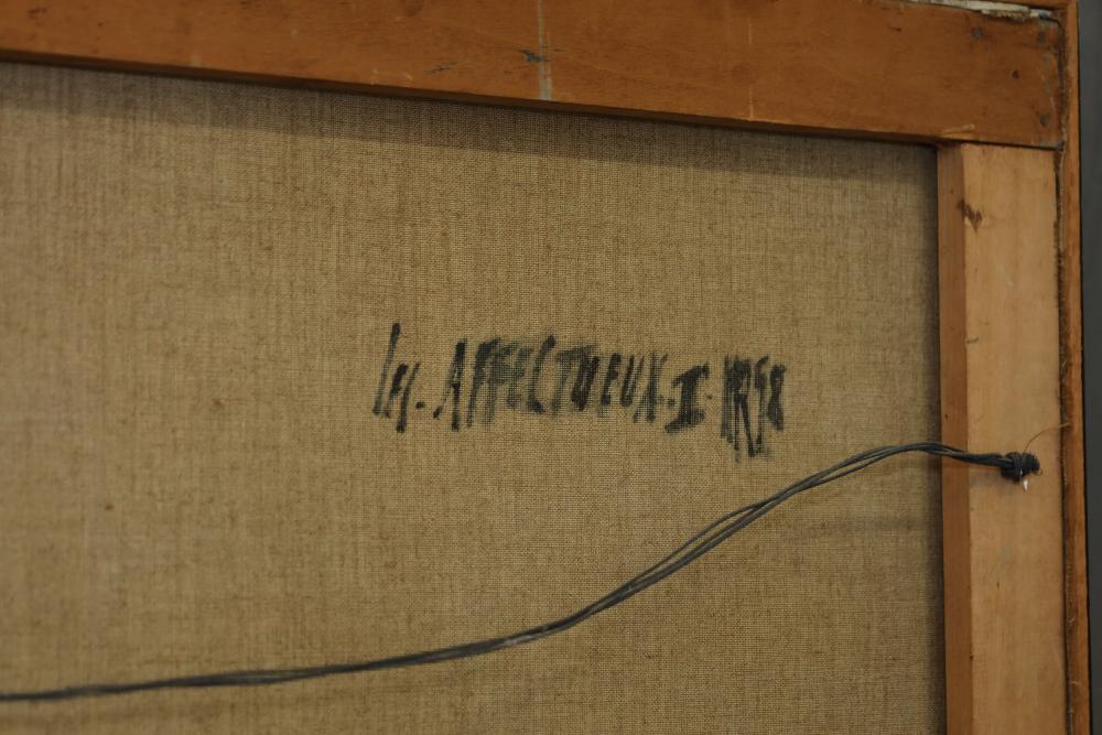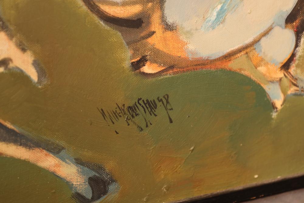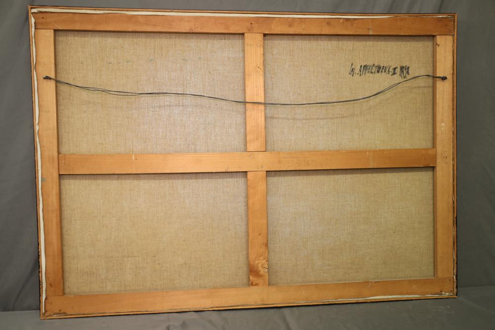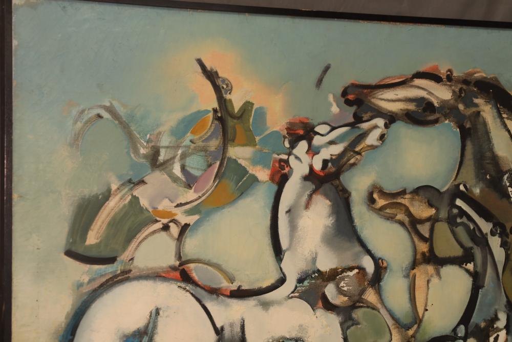 Oil on Canvas, abstract herd of horses. Signed in middle of painting. Written on back "Les Affectueux - II 1998". Framed 32"x46". Pickup only.