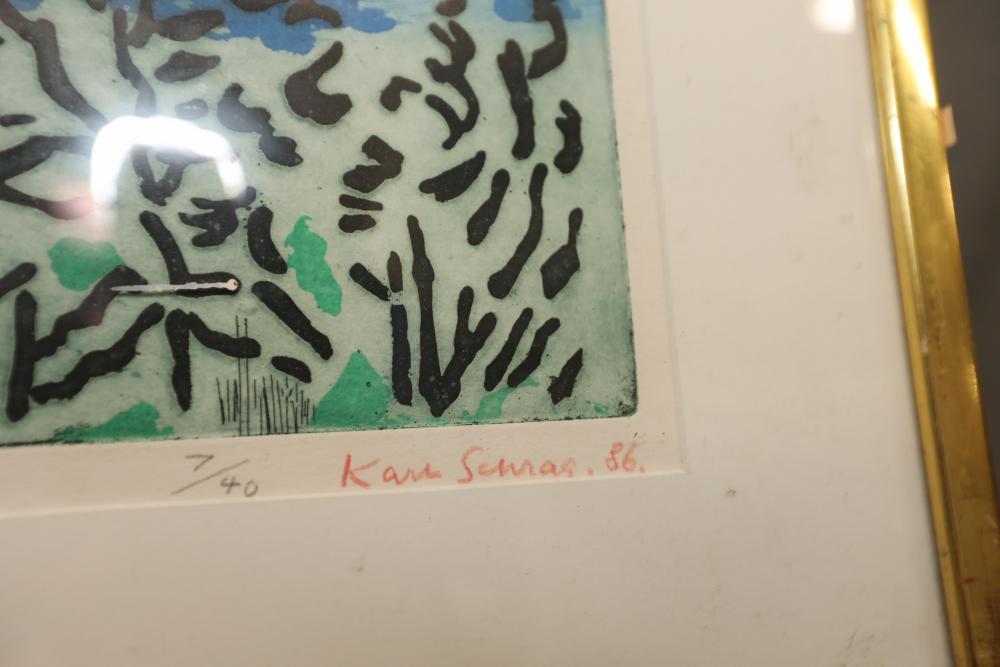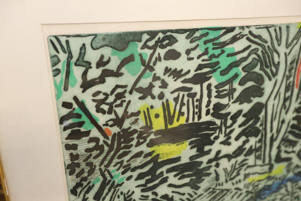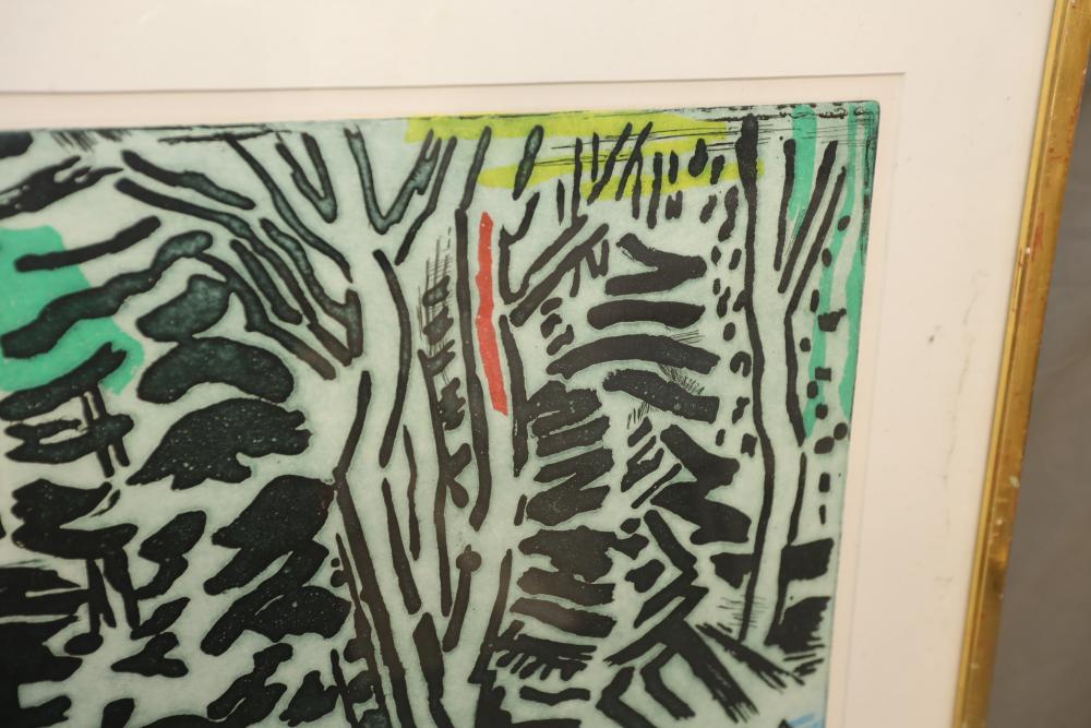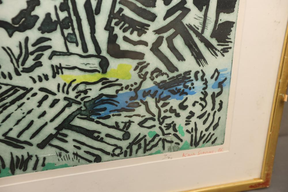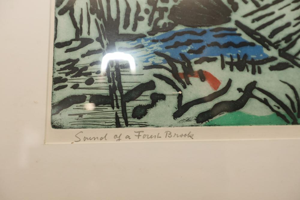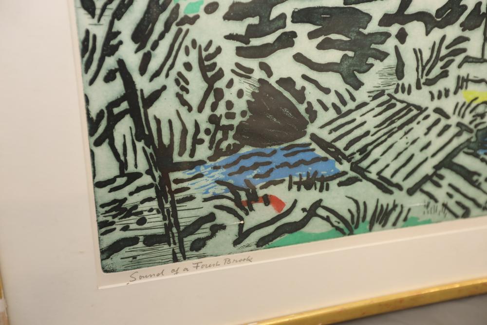 Color etching and aquatint on paper. Titled "Sound of a Forest Brook" Signed lower right " Karl Schrag 86' " numbered 7/40 31"x26". Pickup only.