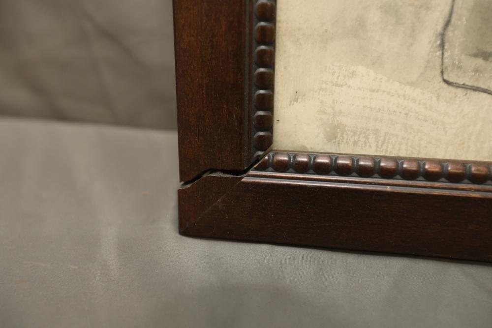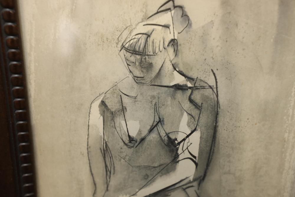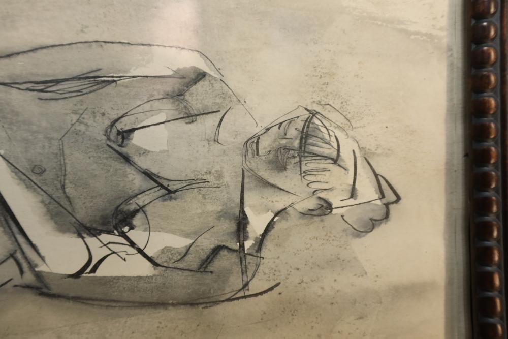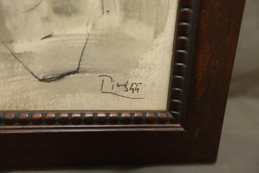 Print on paper framed. Depicting figure of woman kneeling in a water color and sketched style. Signed "Picasso" 16"x10"..