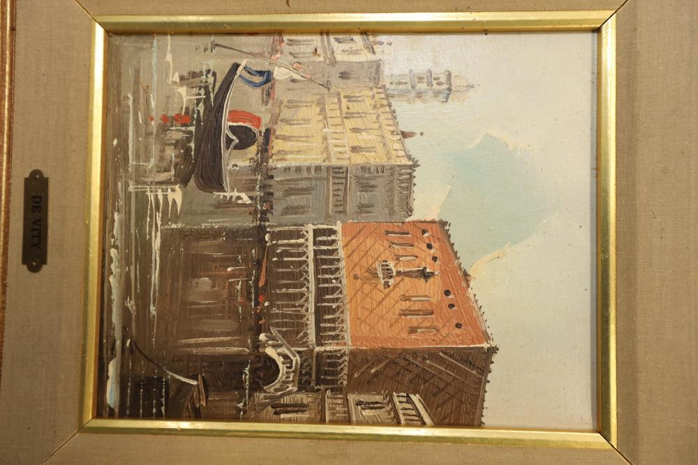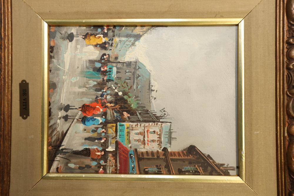 Two Oil on canvases framed. Signed lower right corner "De Vity" City Landscapes 17"x11". Pickup only.