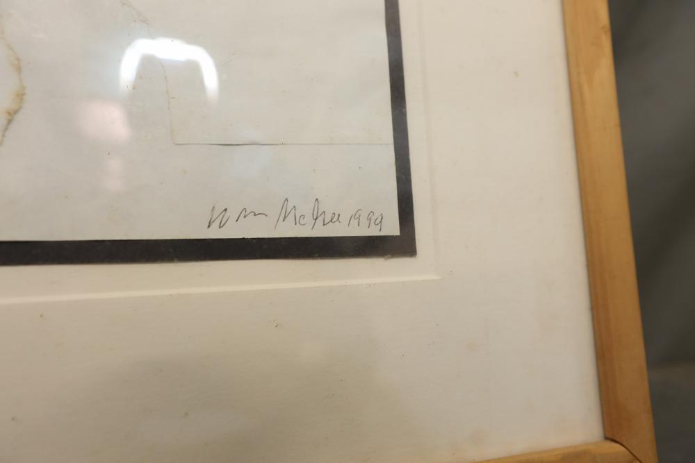 Mixed Media collage on paper. Signed lower right corner Lithograph on paper framed. Snowy landscape with church. Signed lower right corner "William McGee 1999" 23"x20". Pickup only.