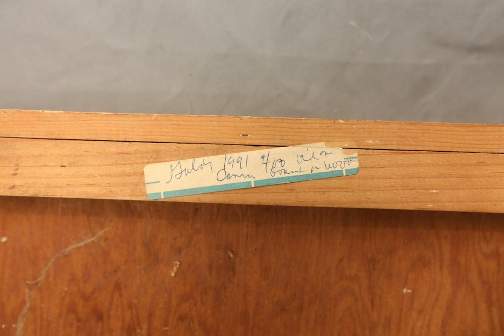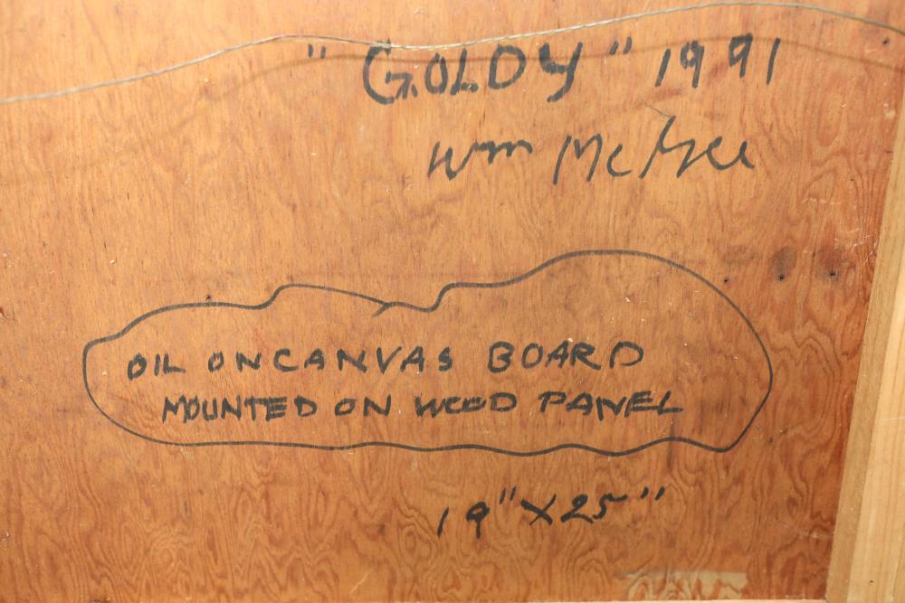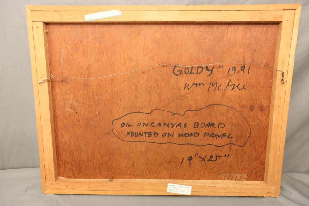 Oil on canvas board mounted on wood panel framed. Signed and titled on back "Goldy" 1991 William McGee" 19"x25". Pickup only.